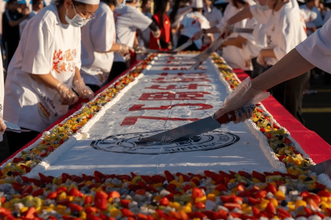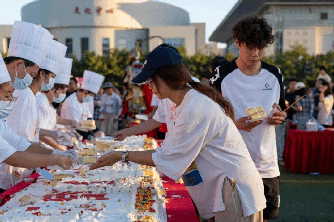 为庆祝学校建校75周年,此次活动特意制作了7.5米×0.6米的巨型蛋糕,学校领导班子为师生们分食蛋糕,共享校园美食节的喜悦。
