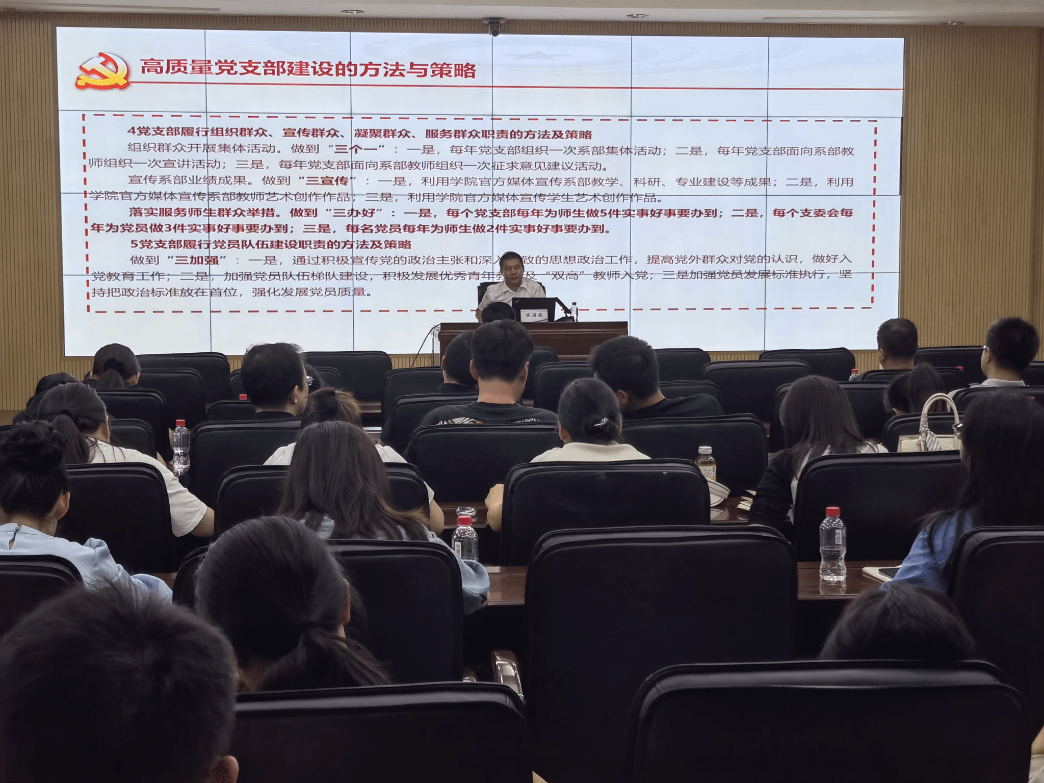 林海森同志从提升高校基层党支部建设业务水平、提升党支部“一融双高”建设质量、做好党支部对标联创等3个方面作了深入浅出的讲解,并引用10余个实践案例具体从思想政治引领、推动事业发展、服务能力建设等方面提出了实践范式。整个讲座内涵丰富、内容饱满、专业性强,对指导做好学校基层党建工作具有较强的针对性和实操性。