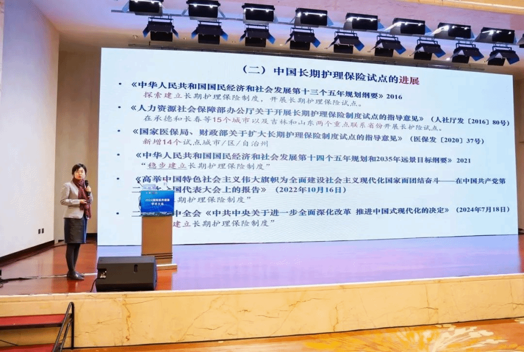 中国人民大学公共管理学院社会保障研究所陈鹤副教授为大会作了关于“长期护理保险试点的实施进展与实施效果”报告。陈鹤副教授通过深入的研究分析和丰富的数据,为我们展示了长期护理保险试点在改善老年人护理服务中的成效和挑战,为未来的推广和政策制定提供了宝贵的参考。
