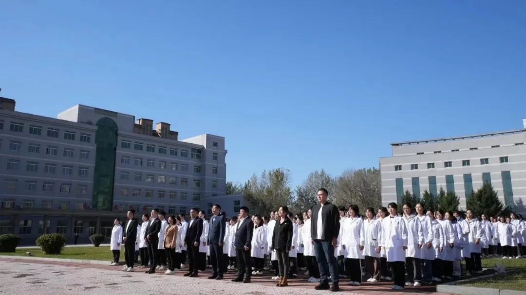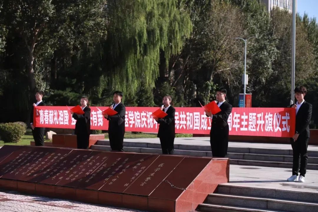 升旗仪式上,伴随着雄壮的《义勇军进行曲》,鲜艳的五星红旗在师生们的注目礼中冉冉升起,全体师生代表在庄严的国旗下合唱国歌,歌声中饱含着对祖国的深情与爱意。礼毕后,学生代表通过诗朗诵深情地赞颂中华人民共和国成立75周年来的辉煌成就,表达出对国家繁荣昌盛的自豪感,以及作为医学生的使命感,承诺将继承和发扬先辈的光荣传统,为中华民族的伟大复兴贡献青春力量。