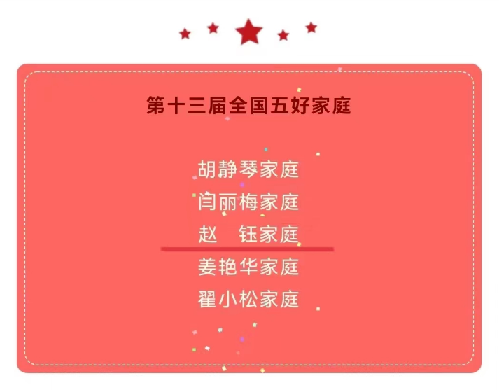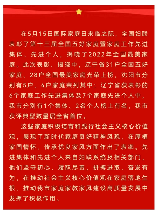 在5月15日国际家庭日来临之际,全国妇联表彰了第十三届全国五好家庭暨家庭工作先进集体、先进个人,揭晓了2022年全国最美家庭。此次表彰辽宁省31户全国五好家庭光荣上榜,沈阳市5户家庭荣列其中,米兰milan官方网站附属中心医院感染科赵钰家庭榜上有名!