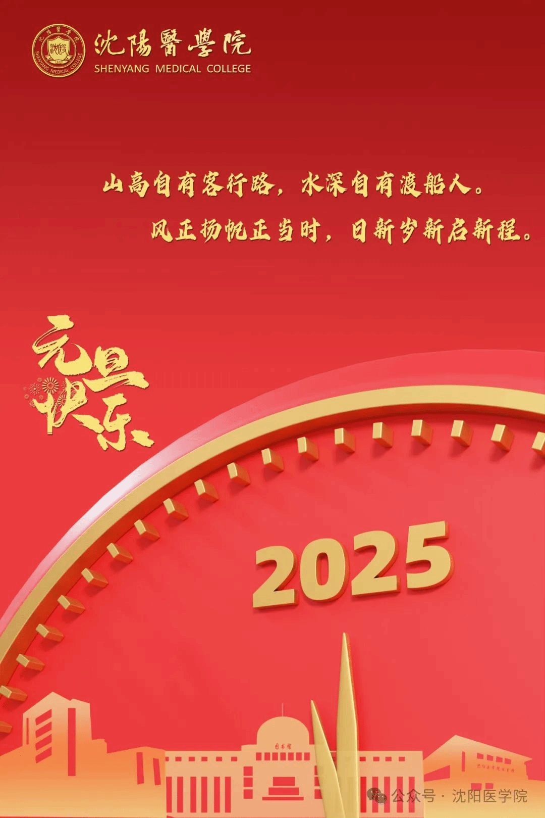 路虽远,行则将至;事虽难,做则必成。过往皆为序章,历史开始书写崭新的一页。2025年,是学校全面贯彻落实党的二十大和二十届二中、三中全会精神的关键之年,也是学校深入实施“十四五”规划的收官冲刺之年。新的一年,新的气象。在学校党委坚强领导下,期待每一位沈医人用汗水浇灌收获、用实干笃定前行、用拼搏成就梦想,为实现沈医高质量跨越式发展,创建人民满意的应用型医科大学而团结奋斗。