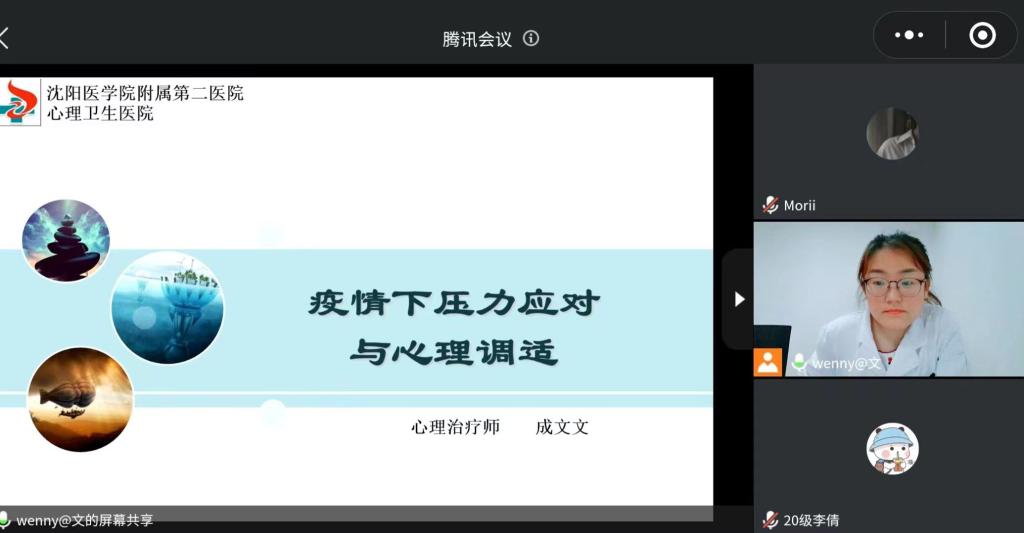 为缓解和疏导疫情期间学生心理压力,帮助同学们积极调节情绪,5月13日19:00,大学生心理健康教育中心邀请附属第二医院心理卫生医院心理治疗师成文文老师做了《疫情下压力应对与心理调适》线上专题讲座。各二级学院辅导员、班级心理委员及部分学生代表共计200余人参与了本次讲座。