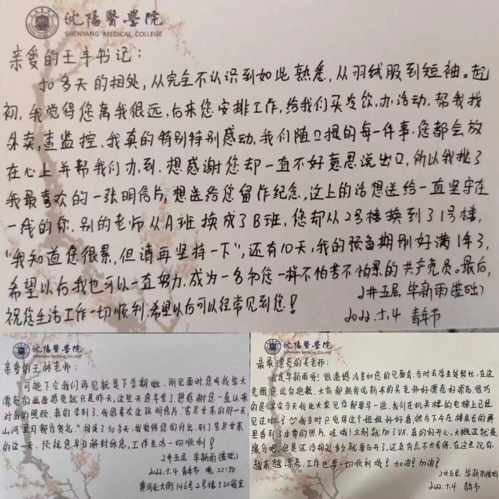 50天的封校时光一晃而过,三位老师要奔赴新的工作岗位了,作为2号楼的一员、同时也是一名预备党员的毕新雨同学,代表2号楼的学生分别向老师们写了感谢明信片,感谢老师们的辛勤付出!