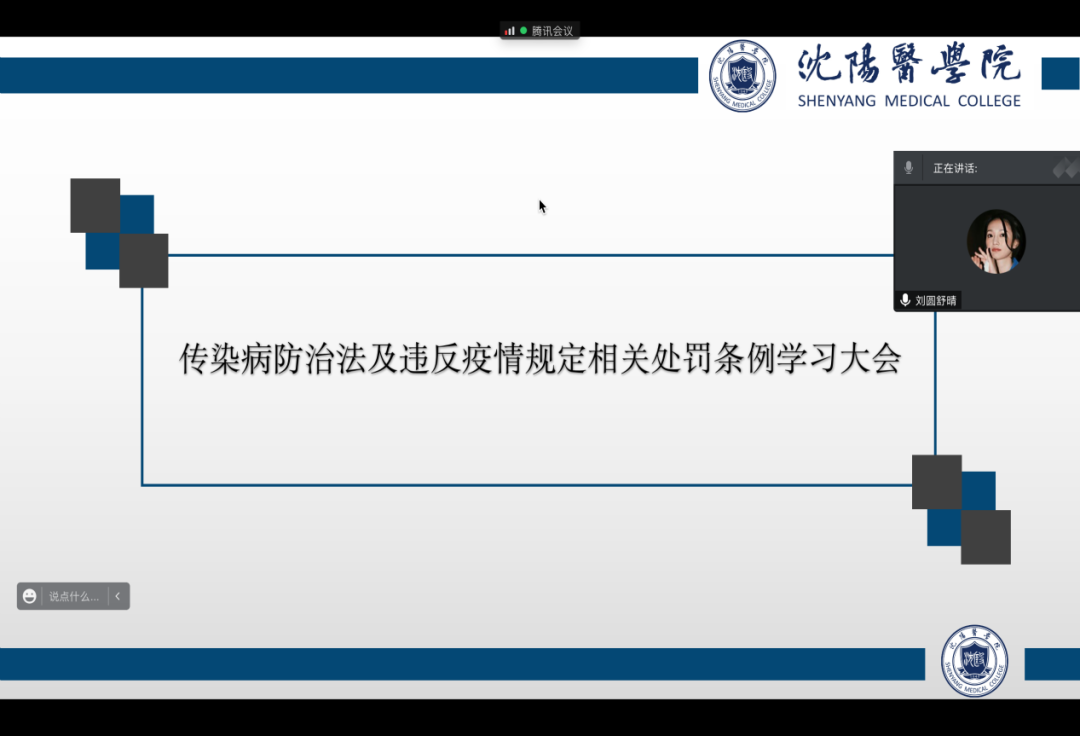 此次学习大会通过腾讯会议线上开展,会议伊始,刘圆舒晴老师带领同学们学习了《中华人民共和国传染病防治法》及传染病防治相关知识,介绍了传染病的类型和传播途径,以及国家在传染病预防、疫情控制、医疗救治、保障措施等各方面的法律规定。让同学们了解到新型冠状病毒在法律上被界定为乙类传染病,现阶段对新冠病毒的预防、管理、救治等一切措施都符合国家法律法规,与新冠的战役刻不容缓。 此外,刘圆舒晴老师还向大家介绍了国家《治安管理处罚法》《突发事件应对法》中有关违反疫情防控社会管理秩序行为及其处罚条例,既拓展了知识面,又提升了法律意识,让同学们明白遵守、配合疫情防控政策人人有责。