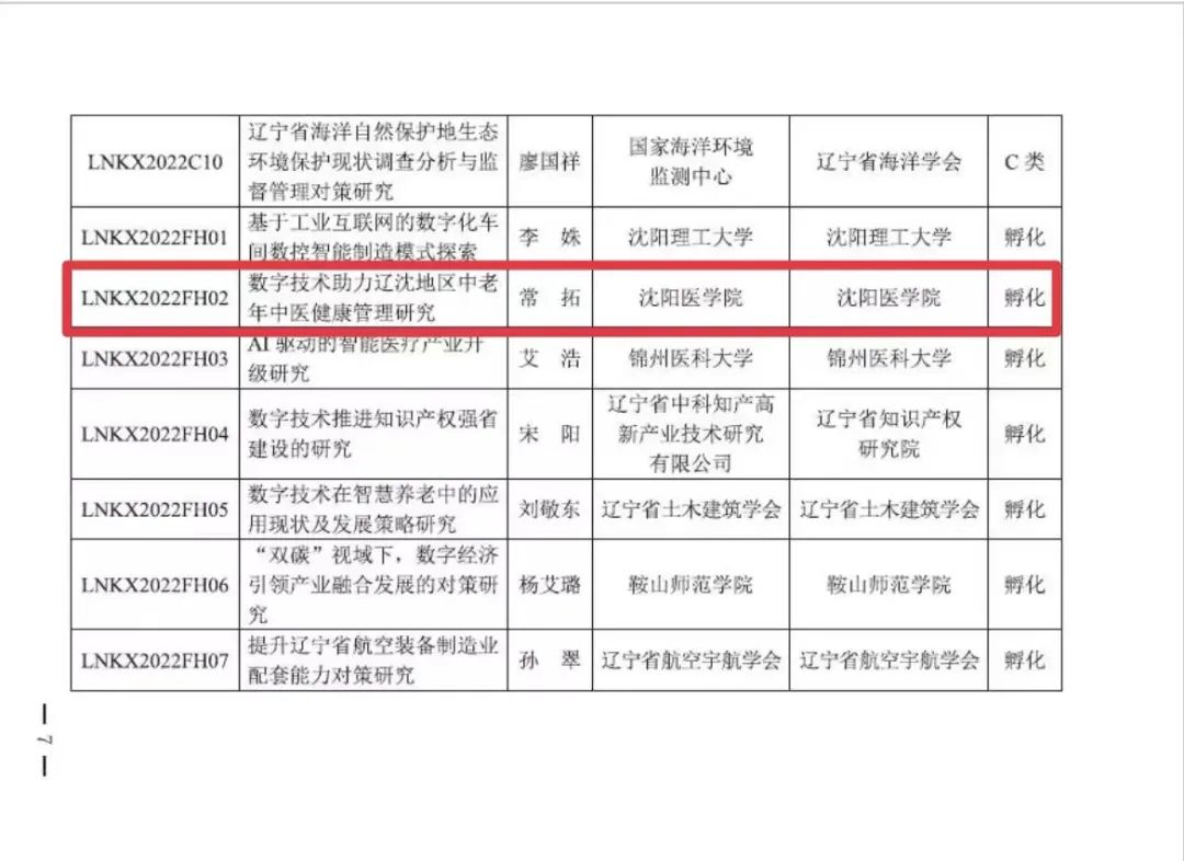 2022年5月7日,辽宁省科学技术协会发布了《关于公布2022年度辽宁省科协科技创新智库项目立项名单的通知》(辽科协办发〔2022〕21号),中医药学院常拓老师申报的课题《数字技术助力辽沈地区中老年中医健康管理研究》获得立项批准。