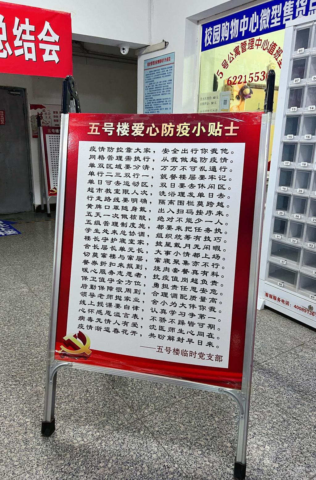 根据学院疫情防控工作总体部署的要求、学生处五级管理制度的指导下,五号楼临时党支部积极响应学校党委号召,全面落实校园疫情网格化防控工作管理制度。秉持“全员志愿,全员奉献,全员网格”的12字服务理念,楼宇全体师生一起积极投身本楼的日常管理、服务保障及文化建设等工作中,确保做到底数清晰、覆盖全面、情况明确、了解透彻。