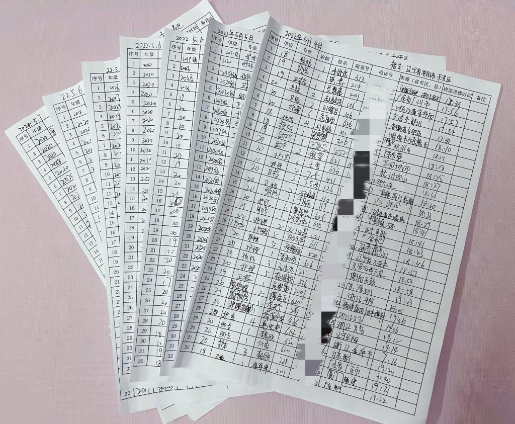 为全面增强学生主体责任,提高学生的主人翁意识,五号楼临时党支部积极营造全员参与、全员共建的生活氛围,同学们全员加入到楼宇疫情防控志愿服务队伍中,每个人都为校园防疫贡献着力量。五号楼在楼宇进门处设置防疫监督小组和快递信息登记处。每个小组由两名志愿者构成,全楼168个寝室、872人依次排序,按时上岗,轮流引导进楼同学在门口及时完成手部消毒,保证入楼安全;同时,监督出楼同学戴好口罩及胸牌。完成进楼快递信息登记,保证每一个快件来处可查,去向明确。