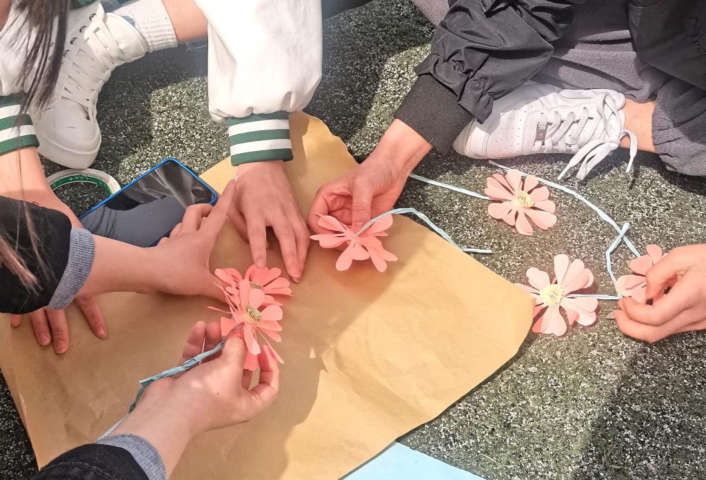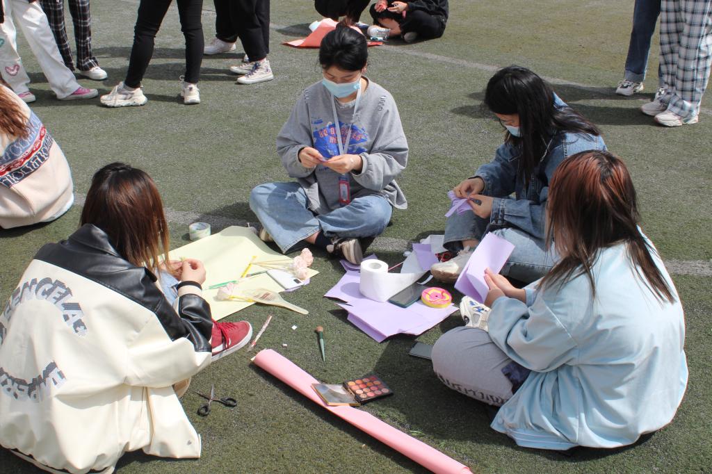 同学们提前准备好了活动所需的卡纸、颜料、剪刀等工具,每组2至5人,大家都迫不及待地开始了手里的“大工程”。一张张普通的纸在他人眼中,可能只是演算难题的草纸,而在参赛同学们的眼里,它们藏着的是大千世界里千变万化的一草一木。同学们充分发挥着自己的想象力和动手能力,不少优秀作品脱颖而出。一张张纸摇身一变,变成一朵朵精致的手工花,平凡和朴素中隐藏着一个个心意。折纸是一门指尖的艺术,是一场视觉的盛宴,将一张纸在手中经过巧妙的翻折、构造等手法,变幻出形态各异的花朵,凭借着婀娜多姿的模样,吸引着大家的目光。