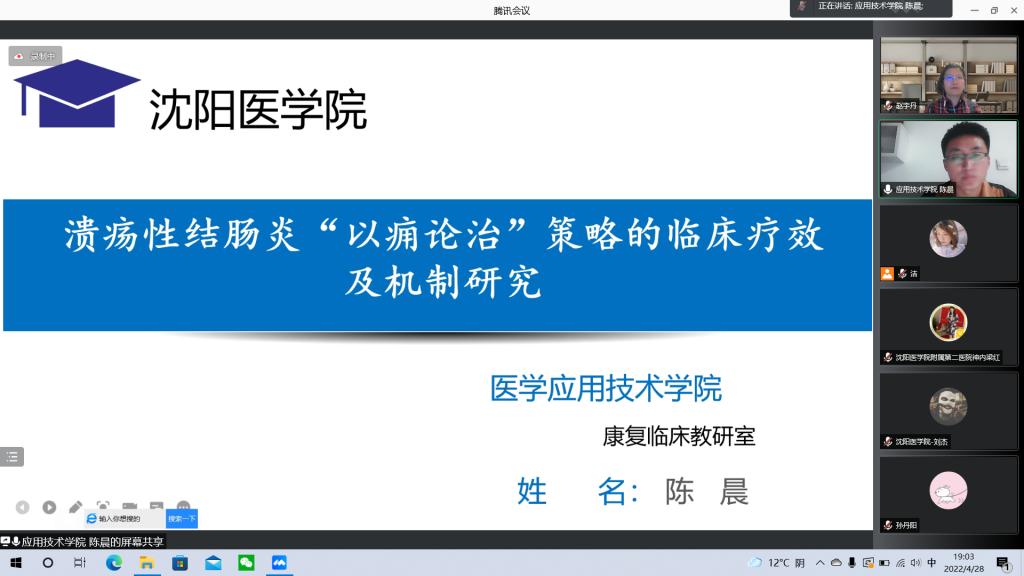 溃疡性结肠炎(ulcerativecolitis ,UC)是一种临床常见病因尚不完全明确的炎症性肠病,具有病程长且缠绵,易反复发作的特点,好发于乙状结肠和直肠,也可延伸至降结肠,甚至全结肠,病变有连续性。近些年来,亚洲国家UC发病率逐渐增高,目前西药对其治疗主要是氨基水杨酸制剂、糖皮质激素以及免疫抑制剂等。本病复发率高,预后差,时间久则有一定的癌变风险,是世界公认的难治性疾病。因此,探索溃疡性结肠炎新的有效治疗手段特别是结合祖国医学优势开展基础及临床研究具有重要的理论和现实意义。在4月28日晚举办的第六十五期博士论坛上,主讲人医学应用技术学院康复教研室陈晨博士基于溃疡性结肠炎的毒热致痈学说,创新性地以中医“以痈论治”理论研究其分子作用机制,展现了中医中药在临床疾病治疗中的独特魅力。