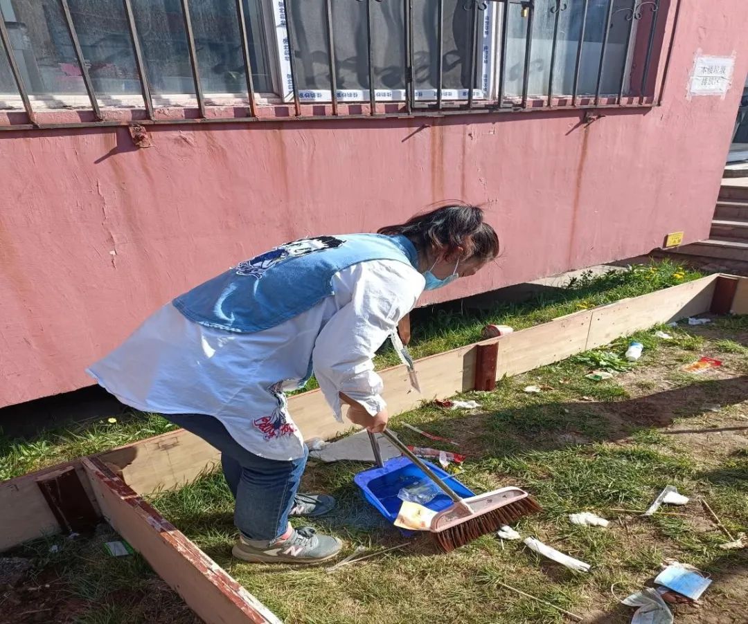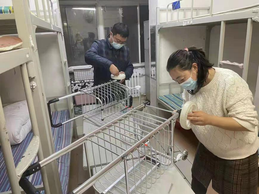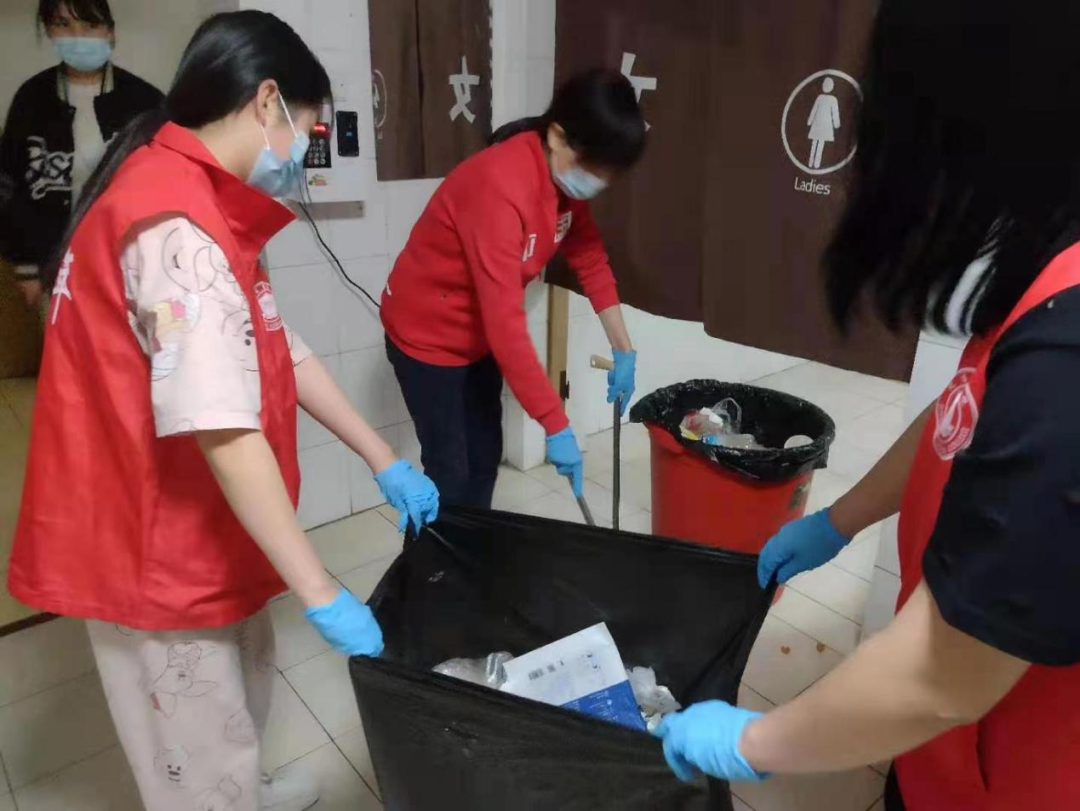 由于校园封闭,宿舍的保洁人员人手不足。为减轻保洁人员的工作量,李萍和学生志愿者一起清理各楼层的生活垃圾,使宿舍整洁卫生,改善学生的生活环境。她说疫情期间工作没有分内和分外,既然我们身在校园,就要发挥自身最大的作用。