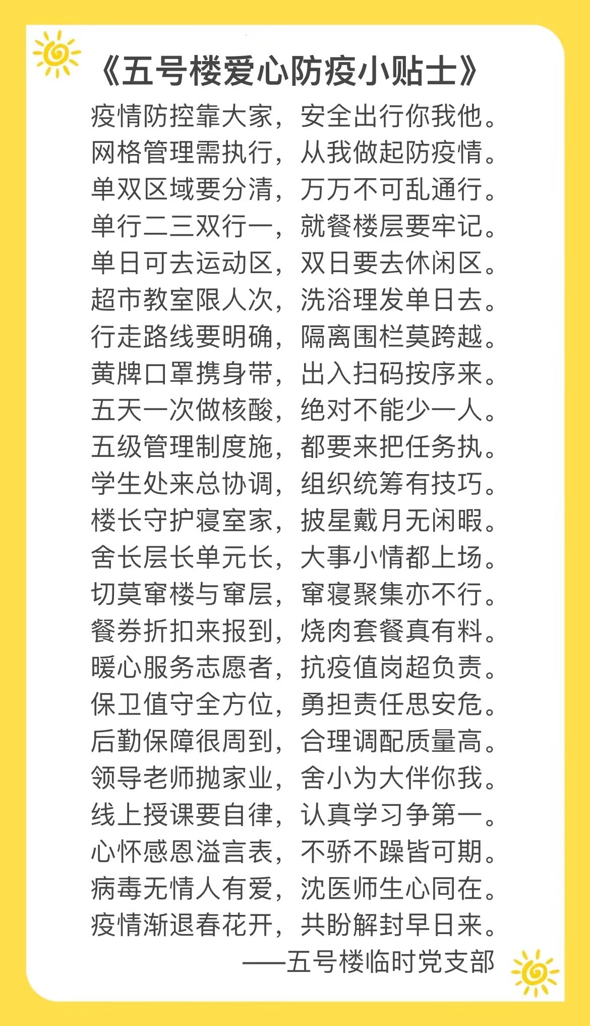 按照学院疫情防控工作总体部署,并在学生处五级管理制度指导下,五号楼临时党支部积极响应号召,全面落实校园疫情网格化防控工作。秉持着“全员志愿,全员奉献,全员网格”的12字服务理念,楼宇师生一起积极投身本楼的日常管理、服务保障及文化建设等工作中,确保做到底数清晰、覆盖全面、情况明确、了解透彻。同时为保证政策解读准确化,网格管理清晰化,实现学生主体责任化,自我管理持续化,为了爱心守护168个寝室和872名学生。单元长公卫学院辅导员吴杨老师精心编写了——《五号楼爱心防疫小贴士》