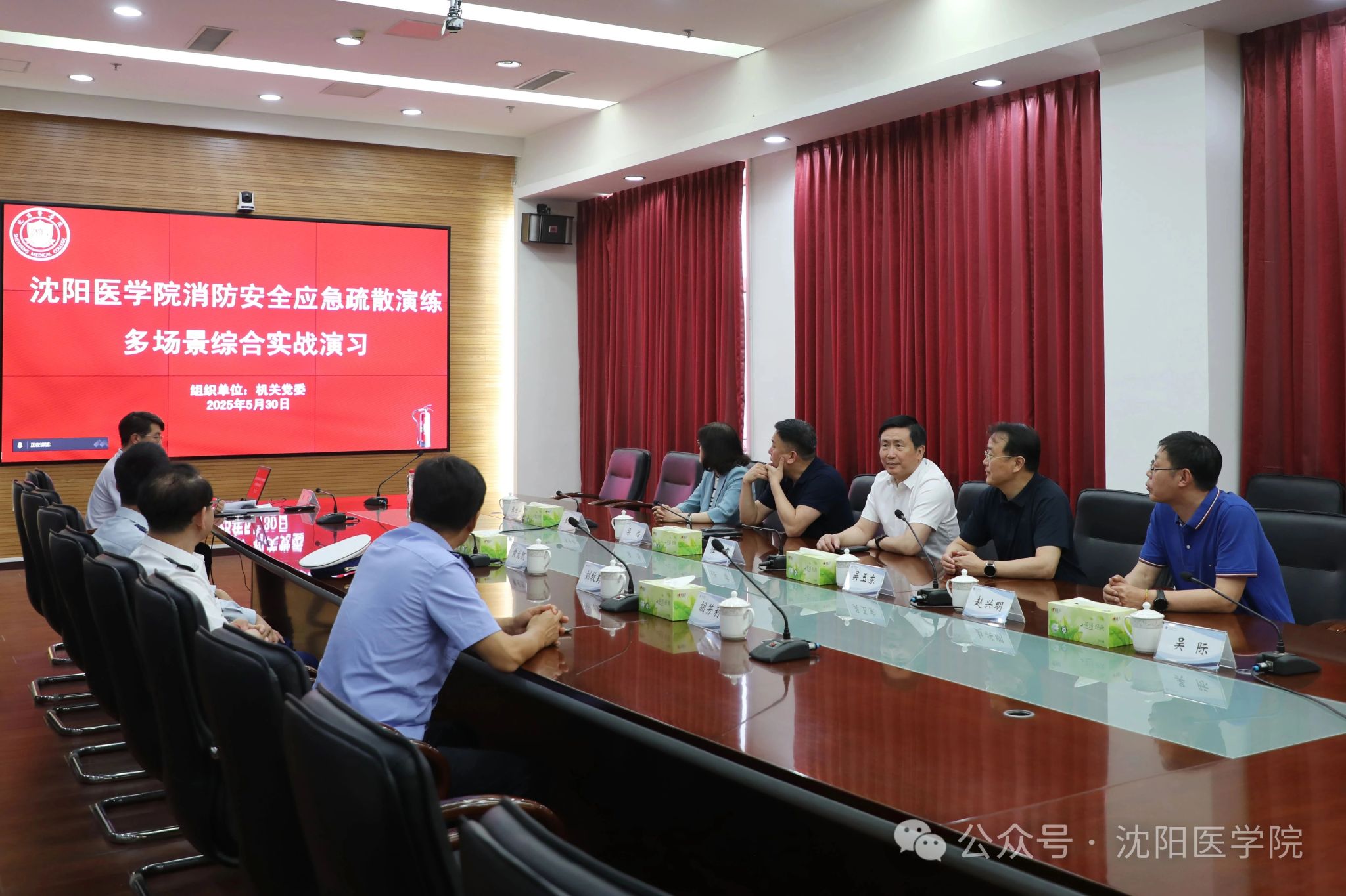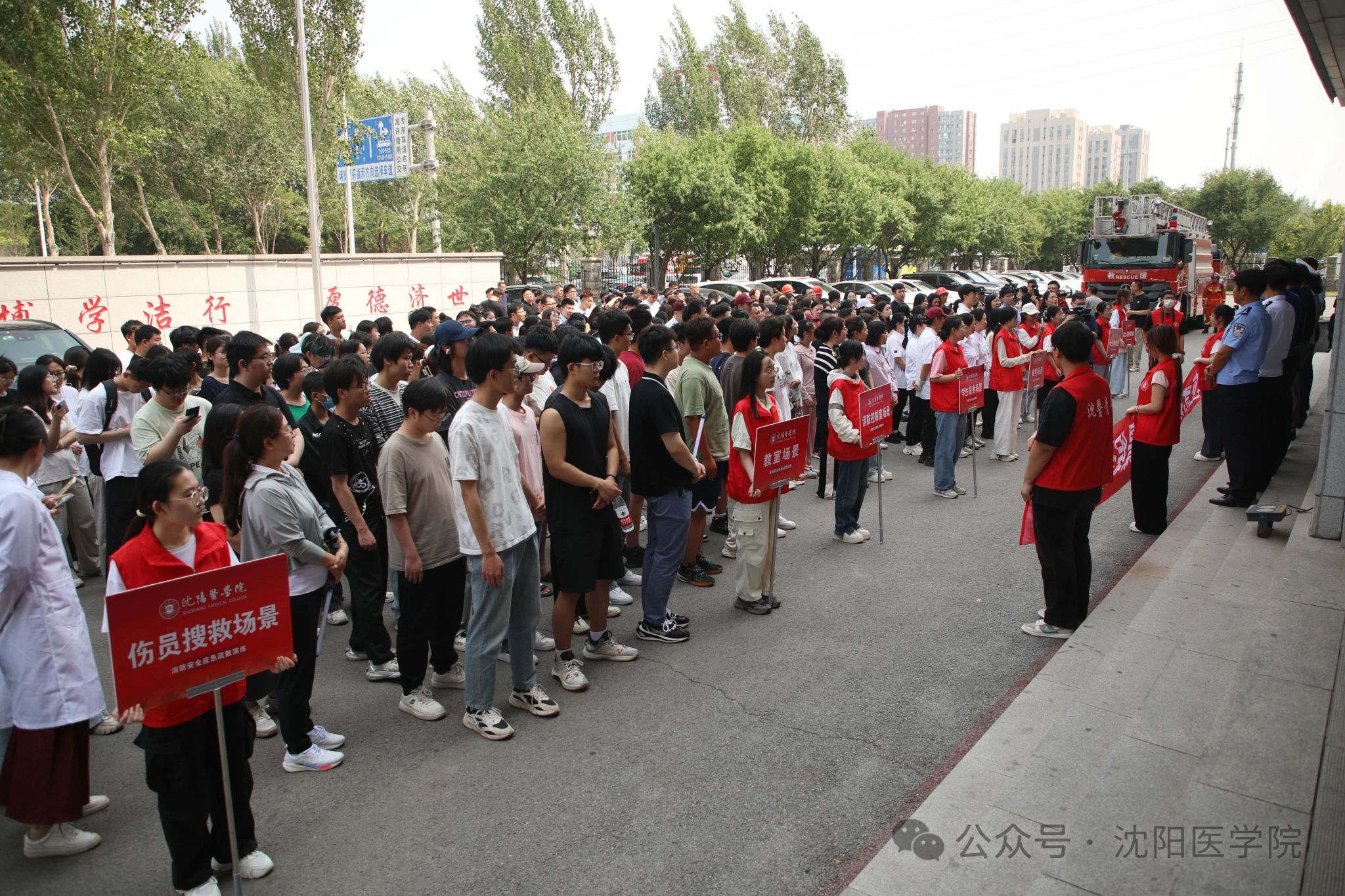 学校党委书记任甫,党委副书记、校长吴玉东,党委副书记梁浩、纪委书记赵兴明、副校长李荣梅及驻校警务专员刘牧野、胡芳利在指挥中心通过监控屏幕观察各个场景、评估演练效果。皇姑消防大队派出消防队员协助本次演练,指导员黄龙凯现场技术指导。本次消防演练保卫处、党政办公室、后勤管理处、教育技术中心、学生处、团委、教务处、医管处、党委宣传部等10余个部门协同参与,参与演练的300余名师生员工均顺利通过实战模拟,检验了学校应对突发火灾的应急处置能力。