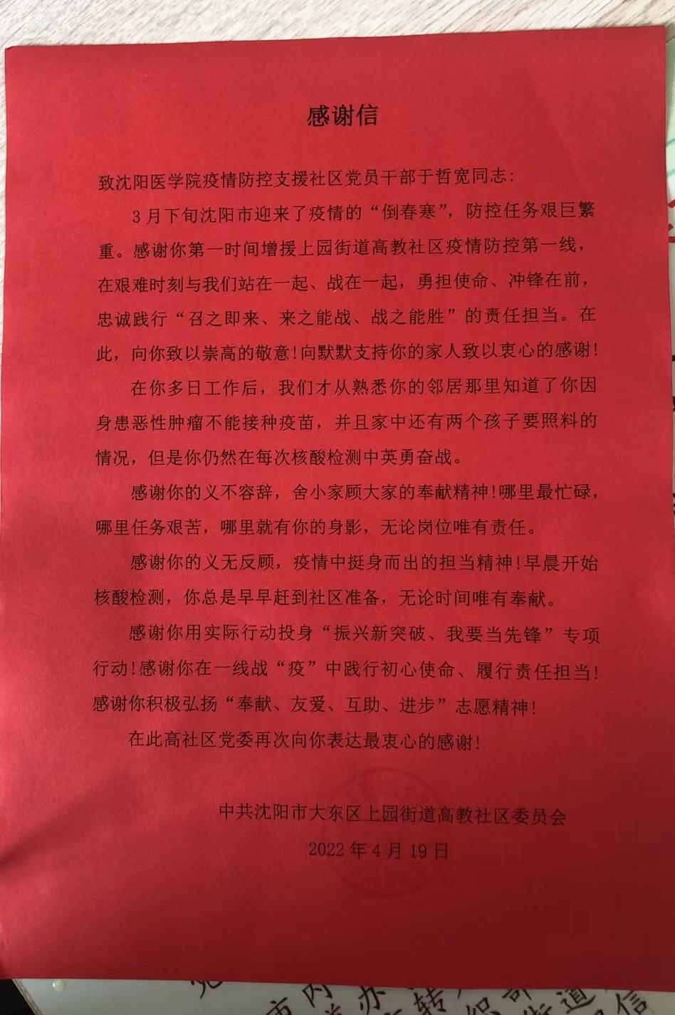 自疫情发生以来,于哲宽同志主动请战到社区参加志愿服务,完成了21天的志愿服务,服务时长累计达90小时。在志愿服务中,他化身“大白”支援核酸检测工作,一旦投入到工作,一日三餐往往无法保障。他家中还有需要照顾的老人和小孩,防护服一穿就是一天,水不敢喝,厕所不能去,但他仍然克服困难、任劳任怨、以舍小家顾大家的党员精神义无反顾参与到志愿者行列中。3月22日,当他得知社区人员因隔离不能到岗工作,便主动担任所在小区的扫码专员,为了高效完成核酸检测任务,他肩负起对其他志愿者进行扫码培训的工作,同时负责在核酸检测现场进行试管清点,通过于哲宽同志的努力,当天的核酸检测任务顺利与上级单位完成了交接工作。