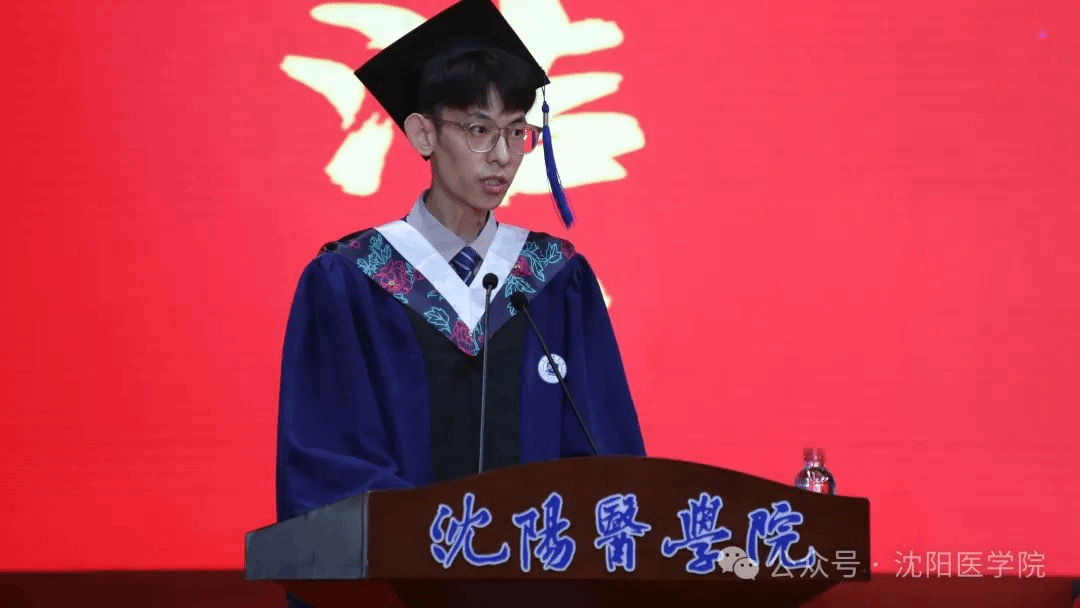 2025届本专科生毕业生代表、第一临床学院临床医学专业王常源同学在发言中,表示将牢记“博学洁行,厚德济世”的校训,把“艰苦奋斗、自强不息”的沈医精神深植心间,始终传承沈医人的精神血脉,把仁心融入民族复兴路,以担当为笔,书写健康中国的医者画卷。