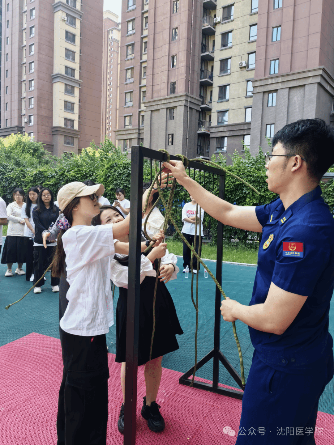 师生们还观摩了高压水枪操作、高空索降等消防员日常训练科目。消防员敏捷的身手和默契的配合赢得阵阵掌声,也让大家对“逆行者”的职业精神有了更深刻的理解。消防员为师生重点讲解灭火器的使用方法及逃生绳的系法。通过“一提、二拔、三握、四压”的口诀,学生们快速掌握干粉灭火器的操作要领,并在消防员的指导下进行灭火实操演练。在逃生绳教学环节,消防员演示“双平结”“渔人结”等实用绳结的打法,并逐一纠正学生的操作细节。一名学生感慨道:“以前只在课本上学过这些知识,今天亲手操作后才发现,应急技能必须反复练习才能熟练运用。”