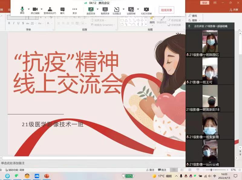 紧密结合当前疫情防控要求,团员青年们以摄影、绘画、自制短视频和文字等形式,向奋战在不同岗位,为打赢疫情防控攻坚战贡献力量的志愿者们表达了温暖的祝福;同时以寝室为单位,组织观看积极向上正能量影片,深入学习领会了伟大抗疫精神;召开了线上宣讲会和交流会,学习榜样精神,彰显当代大学生的责任与担当。
