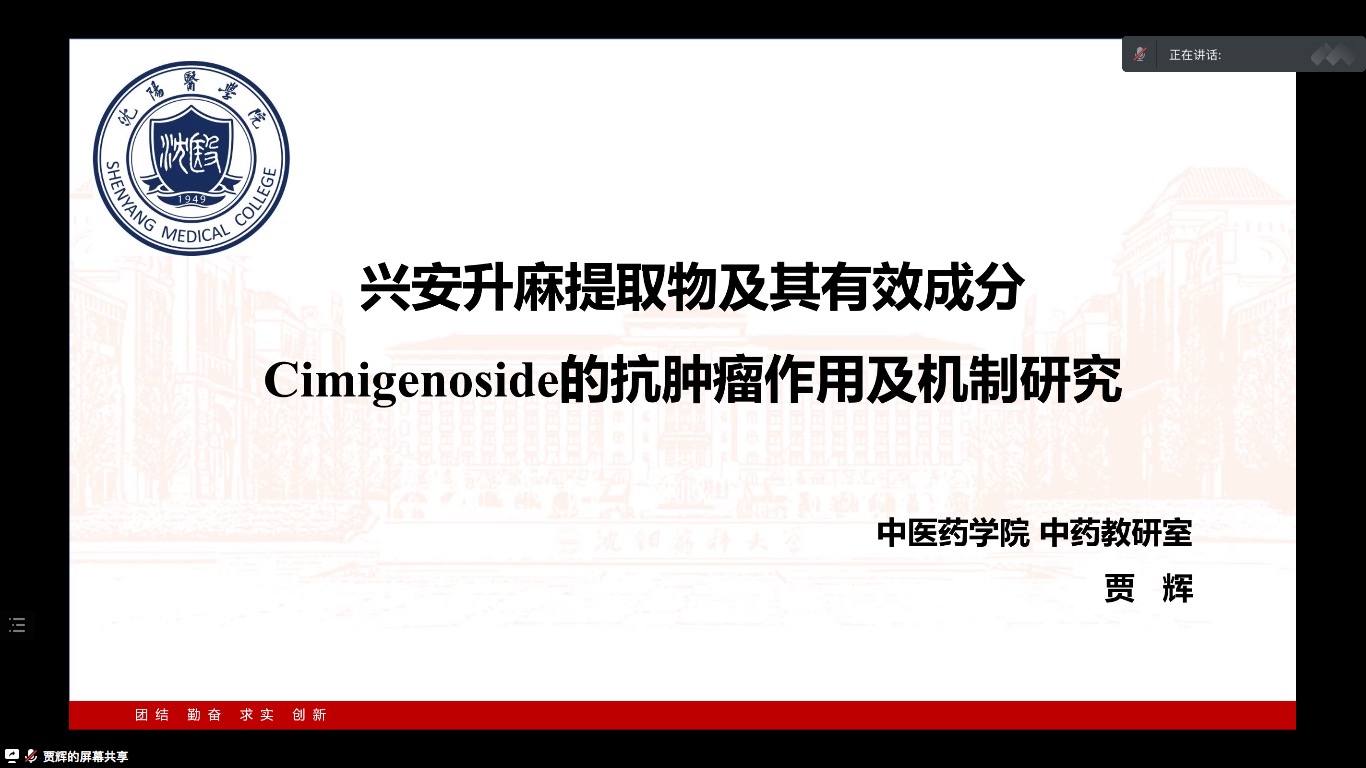 在题为“兴安升麻提取物及其有效成分Cimigenoside的抗肿瘤作用及机制研究”的报告中,贾辉博士结合其博士期间研究内容,介绍了乳腺癌及其临床靶向治疗方案和兴安升麻及其提取物和有效成分的研究背景,系统阐述了兴安升麻提取物CREE体外抗乳腺癌的活性研究及机制研究,兴安升麻有效成分Cimigenoside体外抗乳腺癌活性研究及机制研究,并分享了其研究结果。