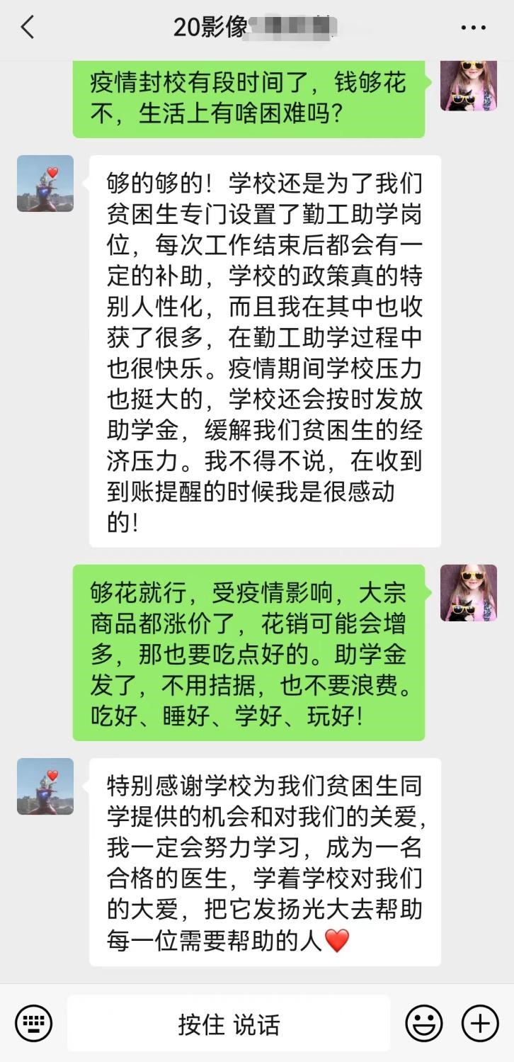 由于校园实行全封闭管理,减少了部分家庭经济困难学生外出勤工俭学机会,为缓解家庭经济困难学生经济压力,保障同学们安心学习。同时,加强校园内疫情防控力量,缓解相关部门人力资源压力,培养学生劳动意识和爱校护校意识,学院增加了勤工俭学岗位,学院为激励特困学生,责成学生处与后勤联动,以宿舍楼为单位每周设立特需学生基金2100元/楼,发放特困生勤工俭学代金券,或奖励在全封闭期间在宿舍楼志愿服务方面做出突出贡献的学生。截至目前累计共发放特需学生基金近10余万元。学生们纷纷表示,有学校这样的坚强后盾,更加坚定了大家的信念,没有推不倒的障碍,没有渡不过的难关。