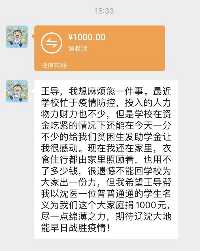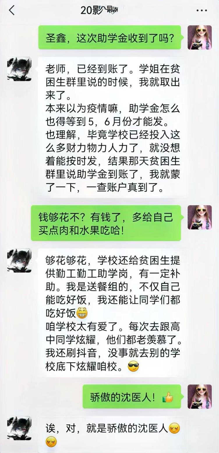受助同学纷纷向学校表达感恩之情,并表示要用实际行动回报学校。一位同学在收到补助后表示,学校提前给贫困生发助学金很让他感动,希望能以一位普通同学的名义为沈医这个大家庭贡献一点力量。