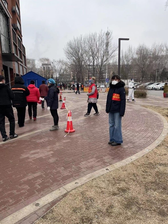 医学应用技术学院教师许玉冰,在确保网络授课任务的前提下,只要一有时间就立即参与到社区志愿服务中来。协助核酸检测,每次上岗都要不停的走动维持秩序,并向居民反复进行提示或解答疑问,半天下来有时嗓子都会嘶哑,但她面对风吹日晒从不退缩。