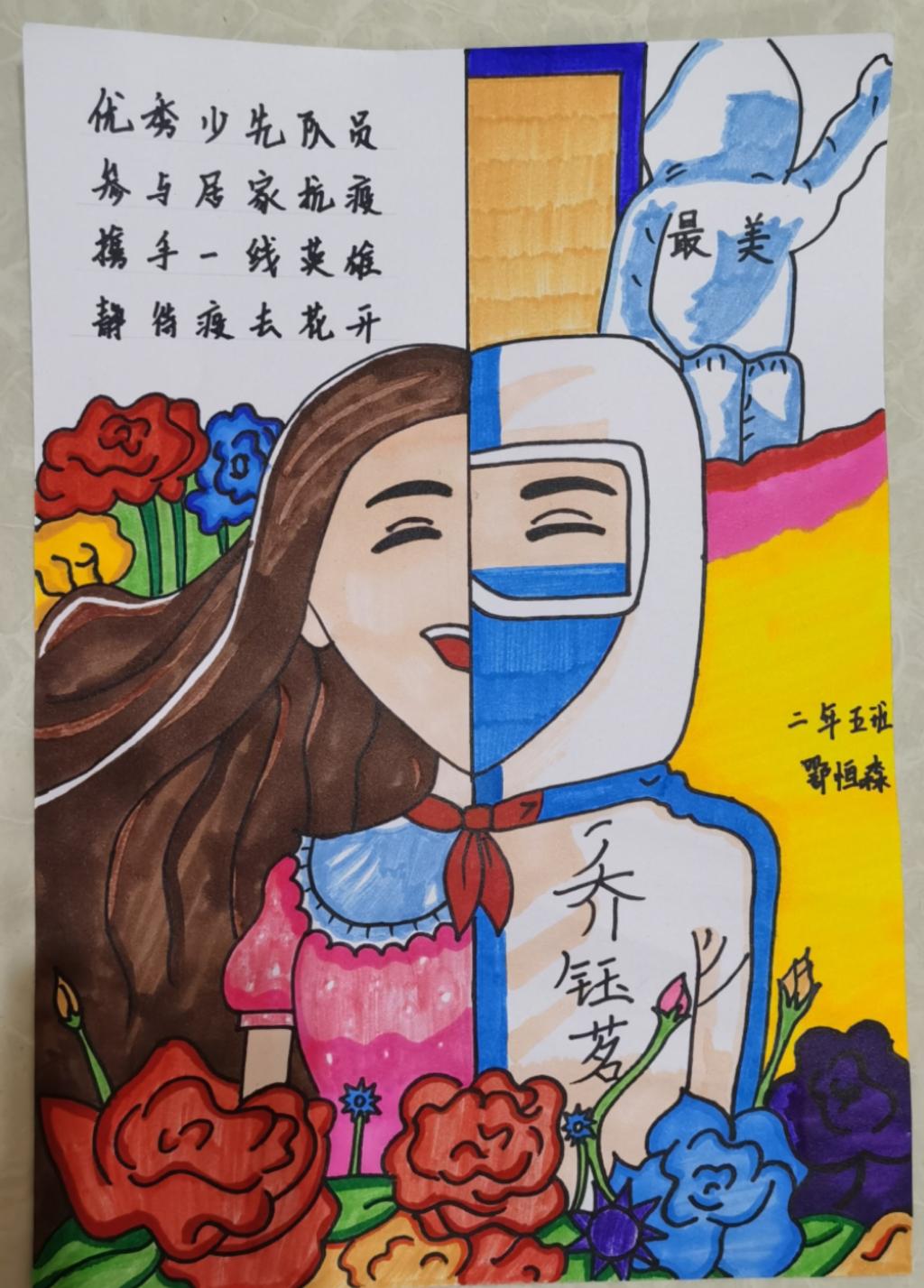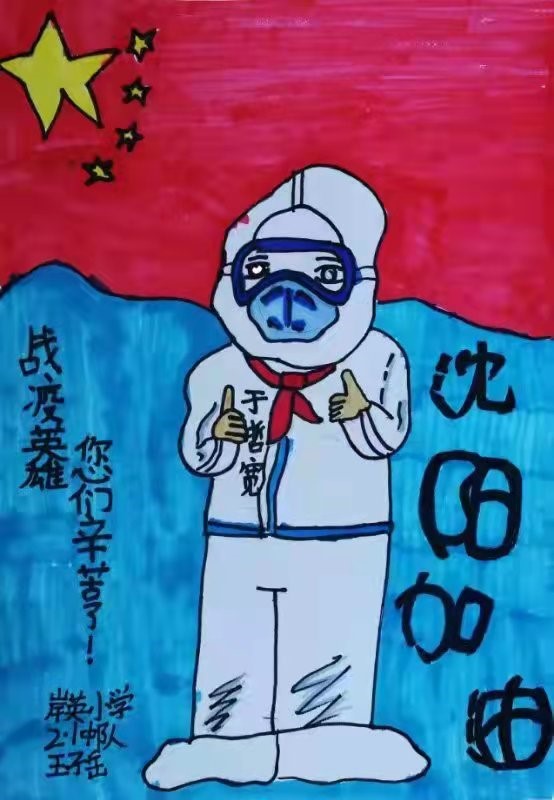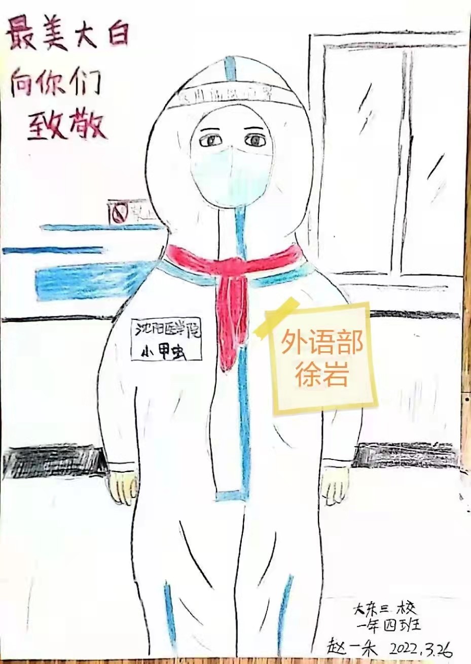 邻家小朋友参加绘画活动——“给大白戴红领巾”,于是画了外语部徐岩在大东区长安街道园中社区参加志愿者活动时的照片,并表达了对所有志愿者辛苦付出的感谢!