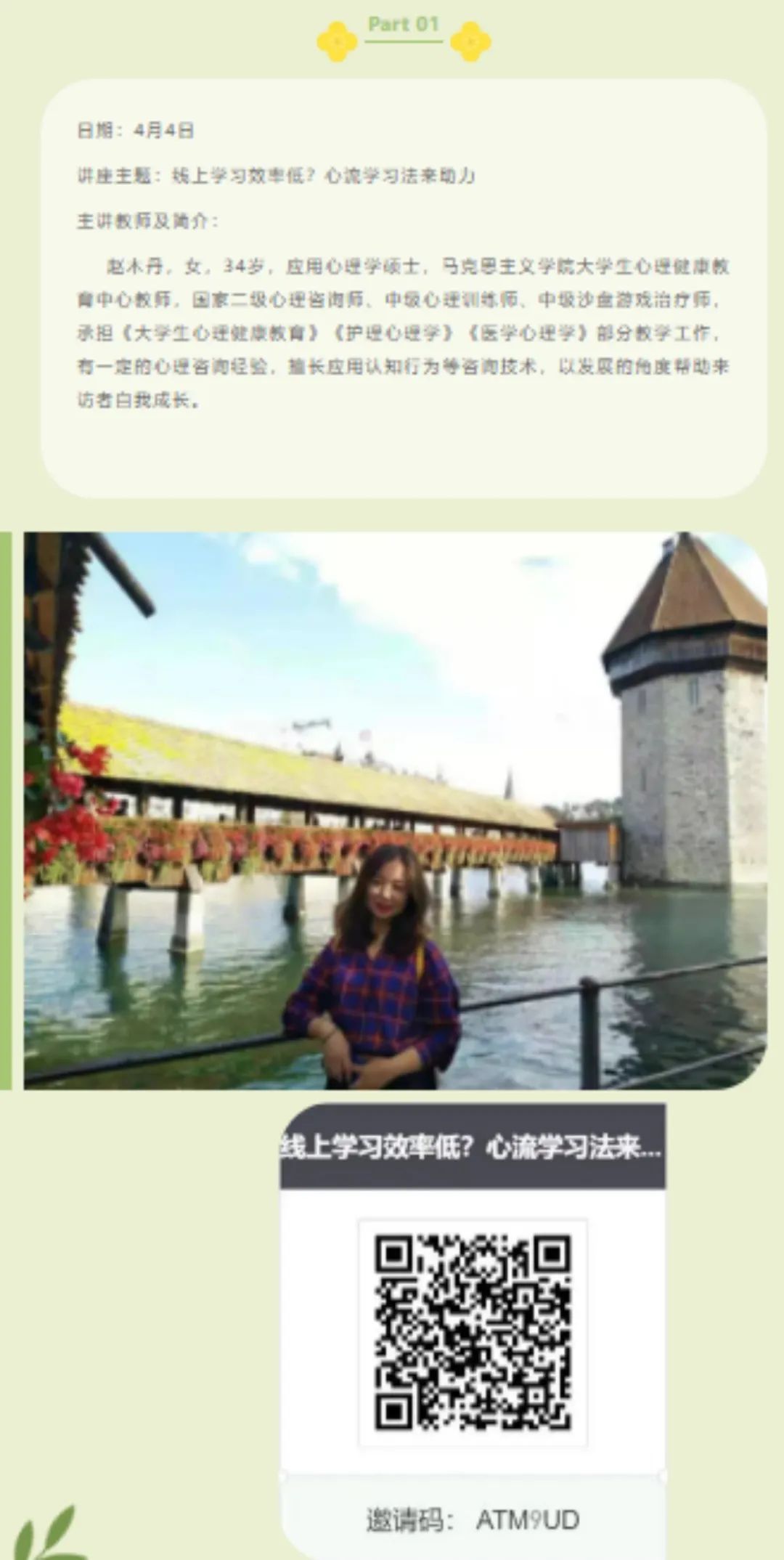 为丰富广大学生课后业余生活,拓展学生视野,强化体育锻炼,增强美育熏陶,3月20日起,每周一至周五晚7时至7时30分,面向全体在校生,利用雨课堂平台,开设“相约七点”系列讲座,讲座内容涉及疫情防控知识培训、浅谈新冠病毒、新冠疫情下的体育锻炼、英美影视主题曲欣赏等文体活动。