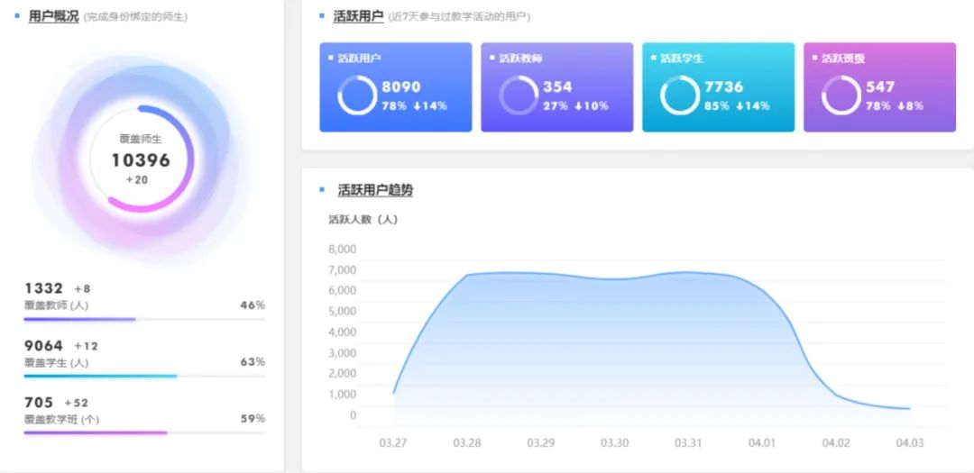 截至4月4日零时,雨课堂覆盖教师1332人、学生9064人、教学班705个。教学活动总数5260次,开课总计4506门,课堂互动80.9612万次,其中习题互动36.9452万次,发送弹幕42.1102万次,教学运行平稳,教学效果良好。
