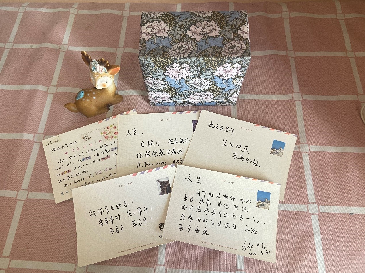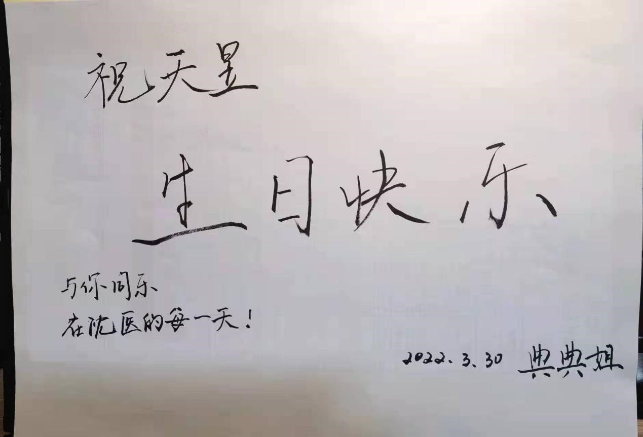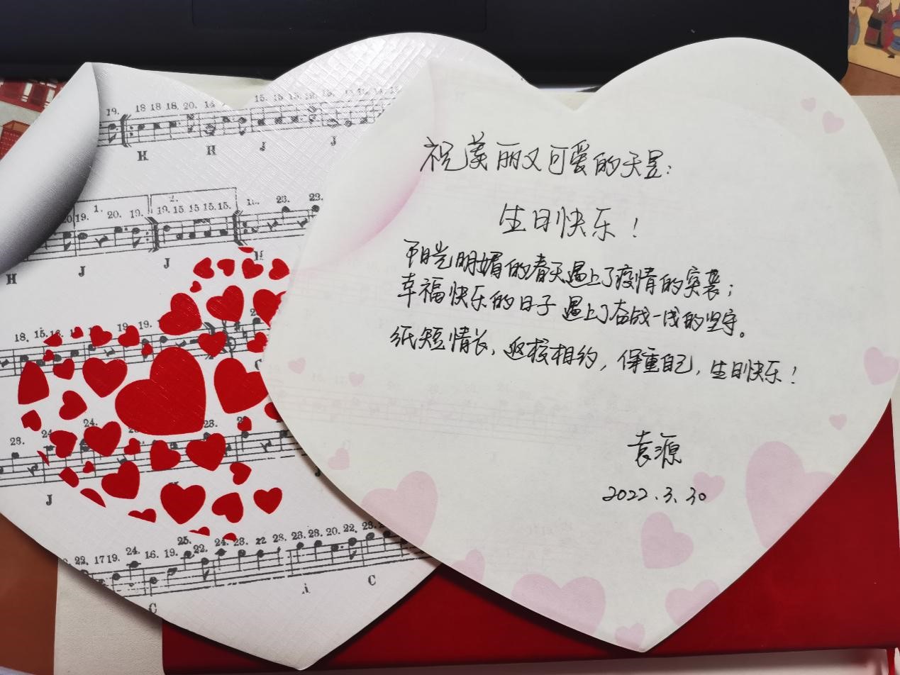 会议结束后我本打算回到学工三参加线上会议,没想到这是基础医学院大家庭精心为我准备的生日会。我走进房间,驻守在学校的家人们一起为我唱生日歌,有插着蜡烛的蛋糕,还有精心准备的生日贺卡和礼物。在校外的线上辅导员也拿起生日祝福卡祝我生日快乐,艰苦的驻守时光瞬间变得浪漫起来。这份突如其来的惊喜也让我感动得热泪盈眶,在蜡烛的闪闪星光中,我许愿:“愿沈医平安,愿疫情早日散去,一切都快点好起来。”