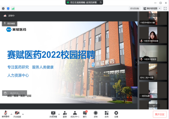 4月1日,药学院邀请到了东北国际医院和賽赋医药人力资源管理处的两位老师为全体毕业生开展了一场企业宣讲会,药学院副院长卢熠,学生工作处万芳,办公室主任孙驰宇,药学院夏爽,付盼出席了本次会议。