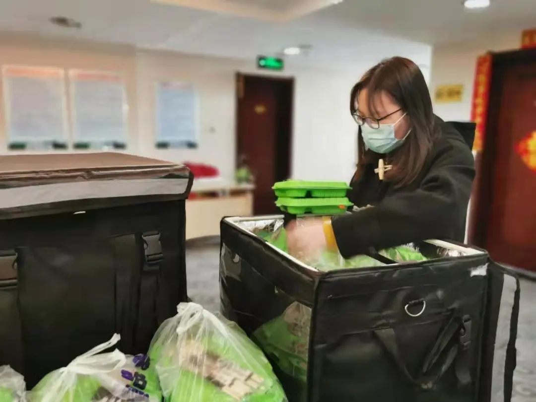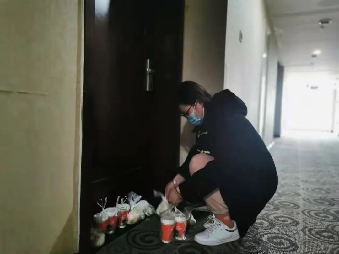 镜头二:因疫情原因,部分硕士研究生在寝室内进行为期14天的自我健康监测,志愿者们主动承担早中晚餐的送餐服务,垃圾清理,生活必需品的购买,并定期为大家发放口罩和水果。