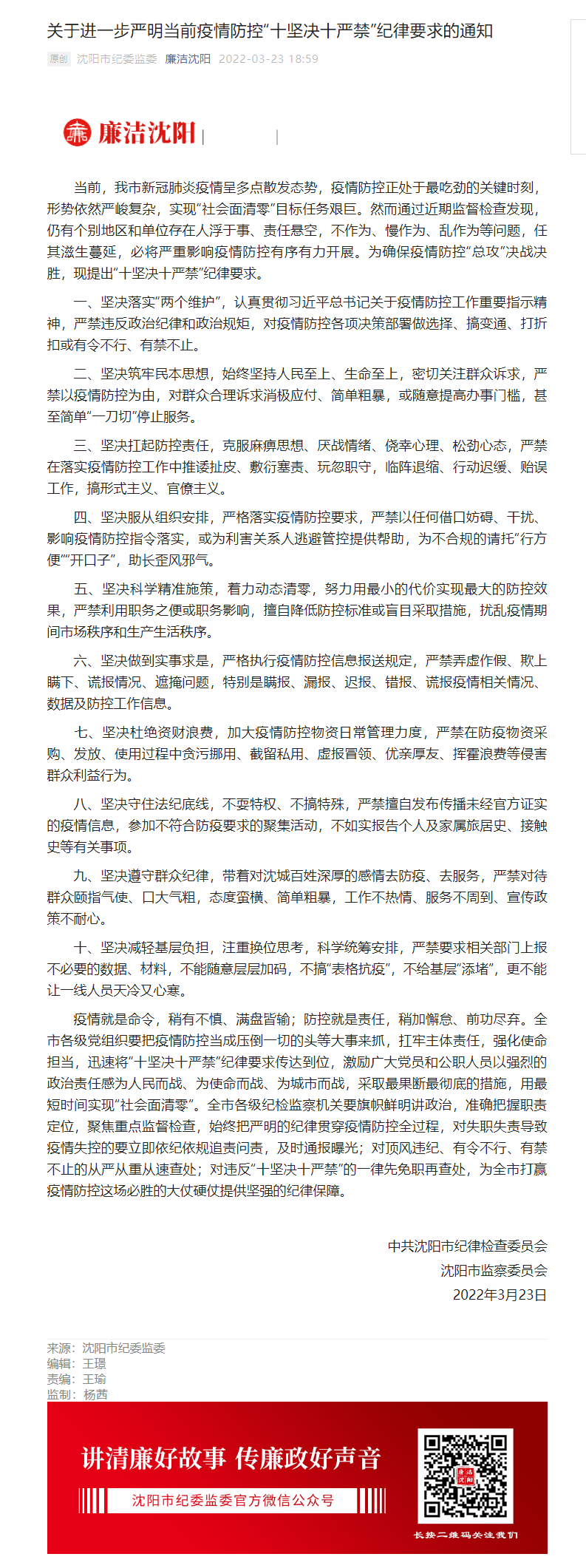 关于进一步严明当前疫情防控“十坚决十严禁”纪律要求的通知