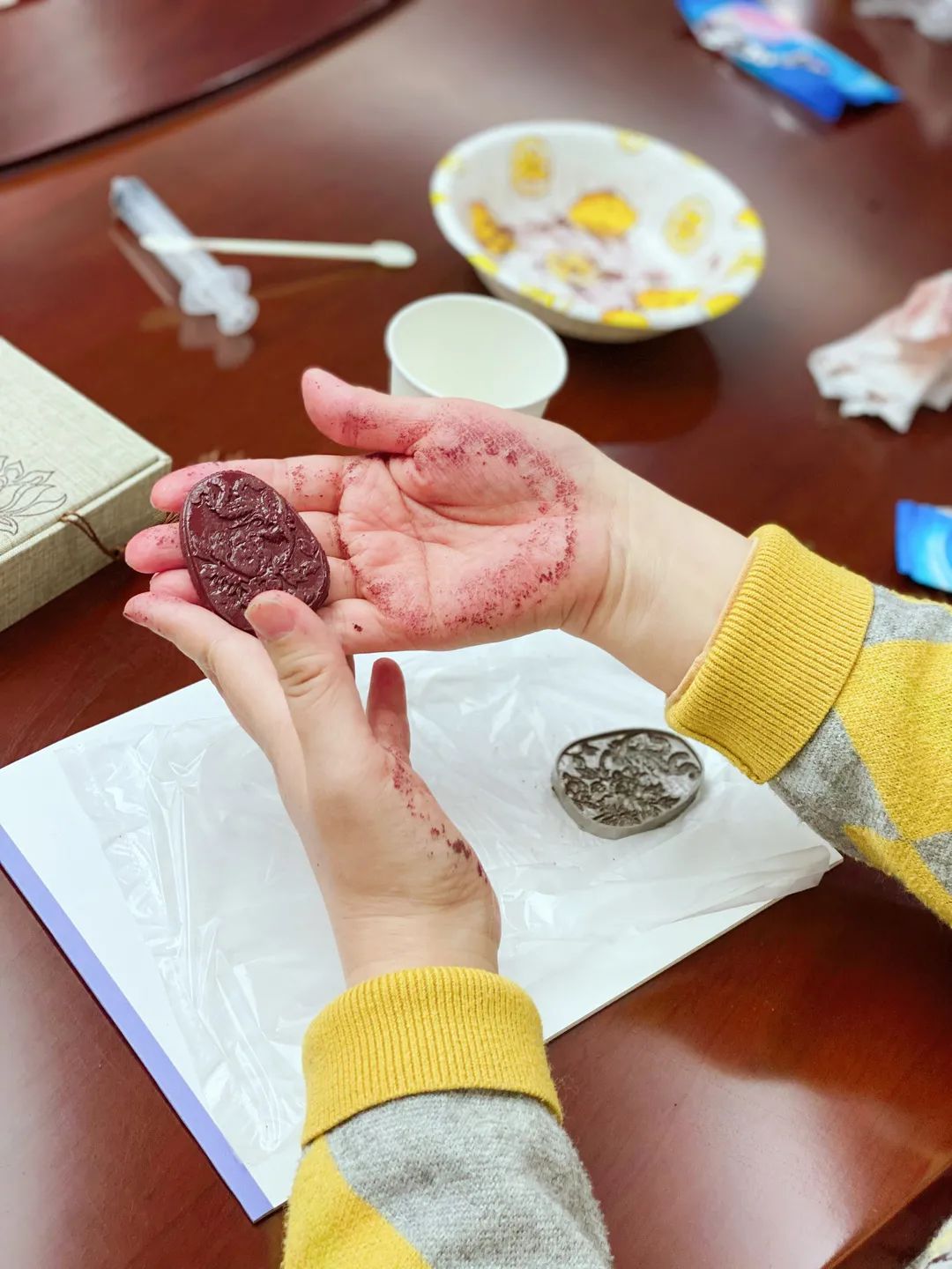 在温婉的音乐声中,大家放下繁忙的工作状态,开启品香制香之旅。香粉是由檀香、丁香、玫瑰、薄荷等多种天然香料加入粘粉混合而成,教职工通过多次加水搅拌,进行揉搓,制成香牌的原料。再选择雅致有趣的模具进行压制、剔边和脱膜,最终完成自制香牌。