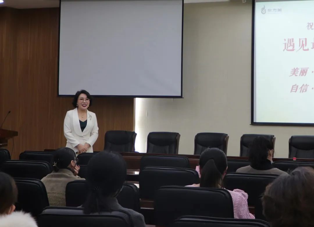 校工会邀请到沈阳东方美美容事业连锁机构董事长、沈阳市第十五届人大代表、辽宁省“三八”红旗手、沈阳市“五一”奖章获得者、沈阳市党代表王萍女士开展“遇见最美的自己”形象礼仪公益讲座,展现职业女性的魅力风采。