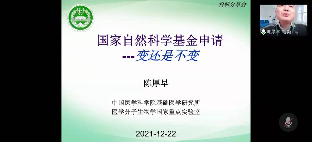 为更好地备战新一年国家自然科学基金申报工作,指导申报人完善标书撰写,学院特邀请教育部“青年长江学者”“万人计划”青年拔尖人才、国家自然科学基金优秀青年科学基金获得者、中国医学科学院陈厚早研究员作专题指导报告。陈厚早研究员以《国家自然科学基金申请——变还是不变》为题,分别从申请人和评审专家的角度就基金申请书撰写要点进行了详细的阐述,着重围绕科学问题属性、项目摘要、立项依据、研究内容、关键科学问题、特色和创新点等分项进行了细致讲解,同时结合个人申报面上项目和重点项目的申请经历,做了“庖丁解牛式”的案例分析。作为国家自然科学基金会评审专家,陈厚早研究员针对青年基金和面上项目评议要点、专家评价侧重点等内容进行说明。在报告的最后,陈厚早研究员强调,无论基金项目的资助方向和政策变化与否,要始终坚持科学创新的初心不变、认真的态度不变。他鼓励所有基金申报者释放压力、增强信心,相信自己是“大器晚成”者。在互动交流环节,陈厚早研究员还对与会人员提出的“如何选择代表性文章”等问题进行了详细的解答。与会人员纷纷表示启发很大、受益颇多。