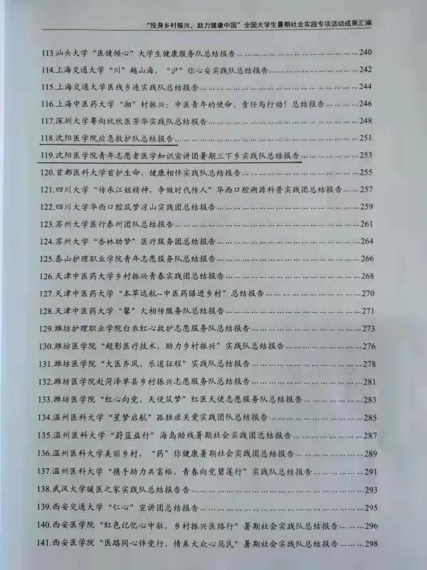 我院两项成果《米兰milan官方网站应急救护服务队总结报告》《米兰milan官方网站青年志愿者医学知识宣讲团暑期三下乡实践服务队总结报告》被编入由共青团中央编写的《“投身乡村振兴 助力健康中国”全国大学生暑期社会实践专项活动成果汇编》中。