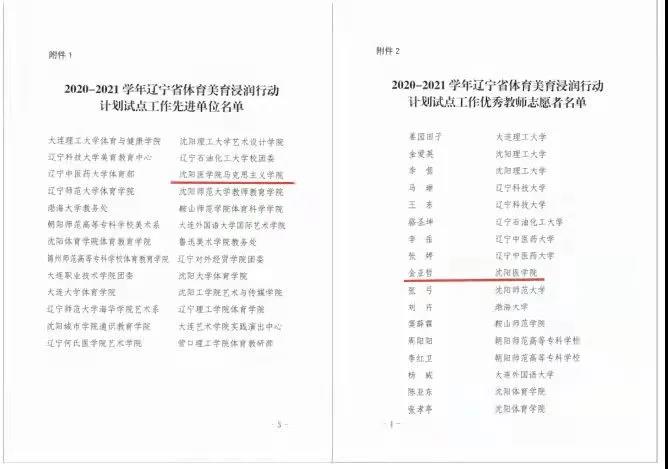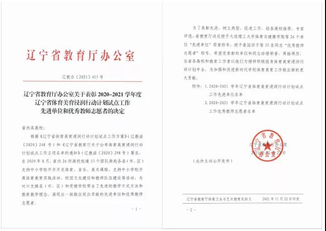 近日,辽宁省教育厅决定对在2020-2021学年度为辽宁省体育美育浸润行动计划做出突出贡献的26个工作单位和35名优秀教师给予表彰。