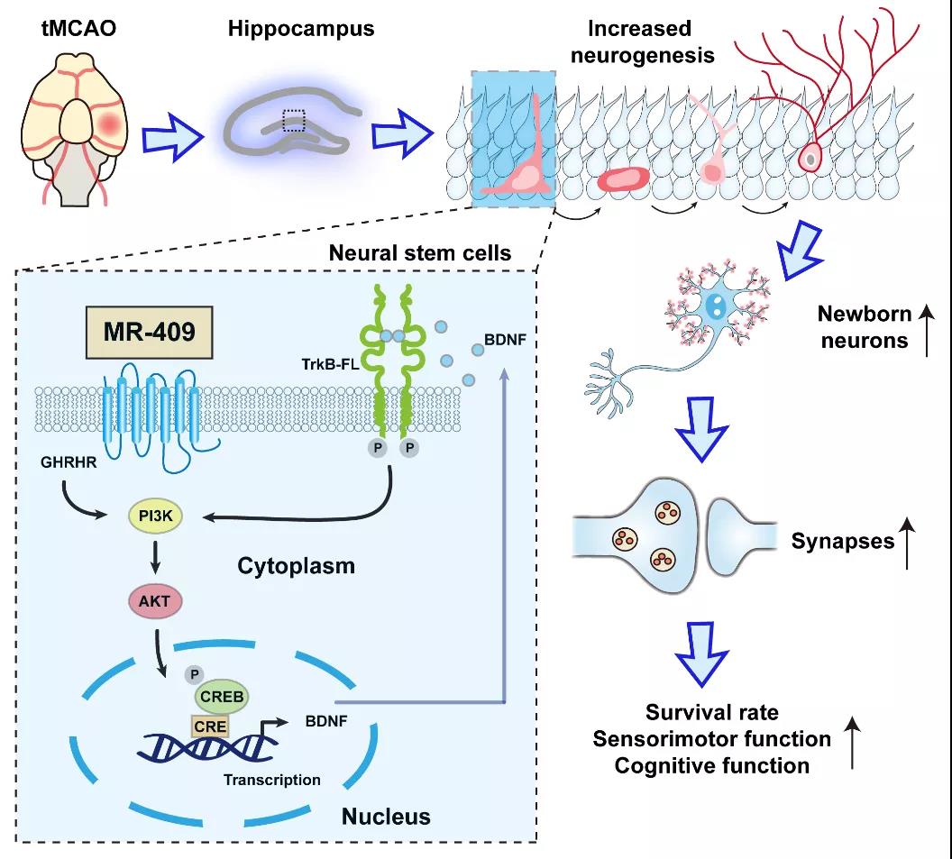 该论文研究了一种人工合成的生长激素释放激素受体(GHRHR)激动剂MR-409对实验性脑缺血损伤的改善作用及机制。周明生教授团队使用MR409治疗缺血-再灌注脑梗塞小鼠(tMCAO),首次发现MR409显著降低tMCAO小鼠的死亡率、脑组织和神经结构的损伤,改善神经感觉、运动和认知功能,促进内源性神经干细胞增殖、分化成新神经元和神经元再生。为进一步明确MR-409促进神经再生机制,团队成员通过RNA-Seq手段结合培养小鼠海马神经干细胞及H9-derived的人源神经干细胞实验,发现MR-409促进神经发生的作用主要通过激活AKT/CREB及BDNF/TrkB通路。因此,团队在临床前期研究中首次发现了一种可用于缺血性脑梗塞治疗的新型GHRH激动剂MR-409具有显著的脑缺血保护作用。该药有望成为治疗缺血性脑梗死的一类临床新药,为缺血性脑梗塞患者治疗带来福音。