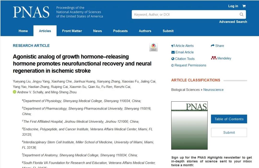 近日,我院周明生教授团队在《美国科学院院报》(Proceedings of the National Academy of Sciences of the United States of America,PNAS)发表题为《Agonistic analog of growth hormone–releasing hormone promotes neurofunctional recovery and neural regeneration in ischemic stroke》的研究性论文,这是我院首次以第一作者和通讯作者署名单位在国际顶级学术期刊发表高水平学术论文。该论文在国家自然科学基金支持下完成,基础医学院生理学教研室周明生教授与国际著名科学家、迈阿密大学Andrew V. Schally教授(1977年医学诺贝尔奖得主)为本文的共同通讯作者,第一作者为基础医学院生理学教研室刘月阳博士。