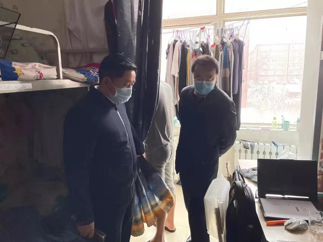 上午9时,吴玉东副院长一行深入学院南门、学生公寓楼、学生食堂,关切地询问了疫情期间同学们的学习生活情况,了解学生寝室供暖情况、用电情况,叮嘱学生注意个人防护,保持良好宿舍卫生。