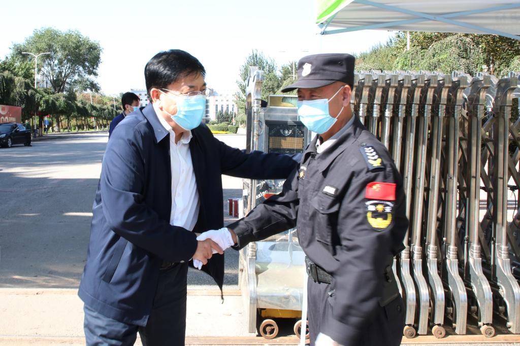 在学院东门门岗,陶庆才书记一行与正在认真值守的保安人员亲切握手。