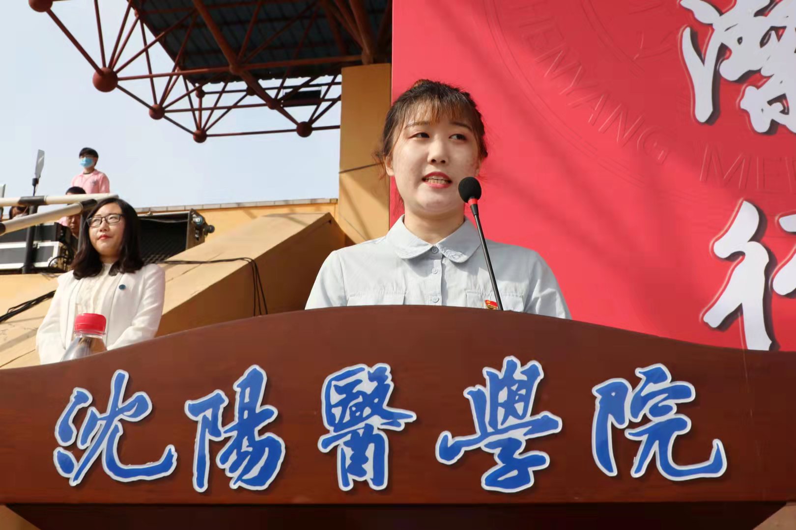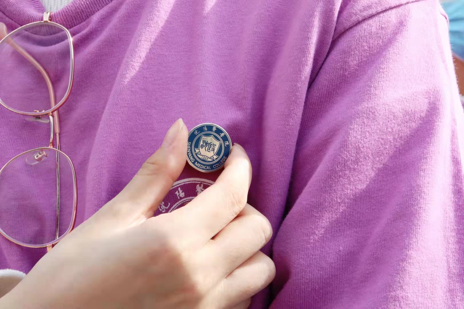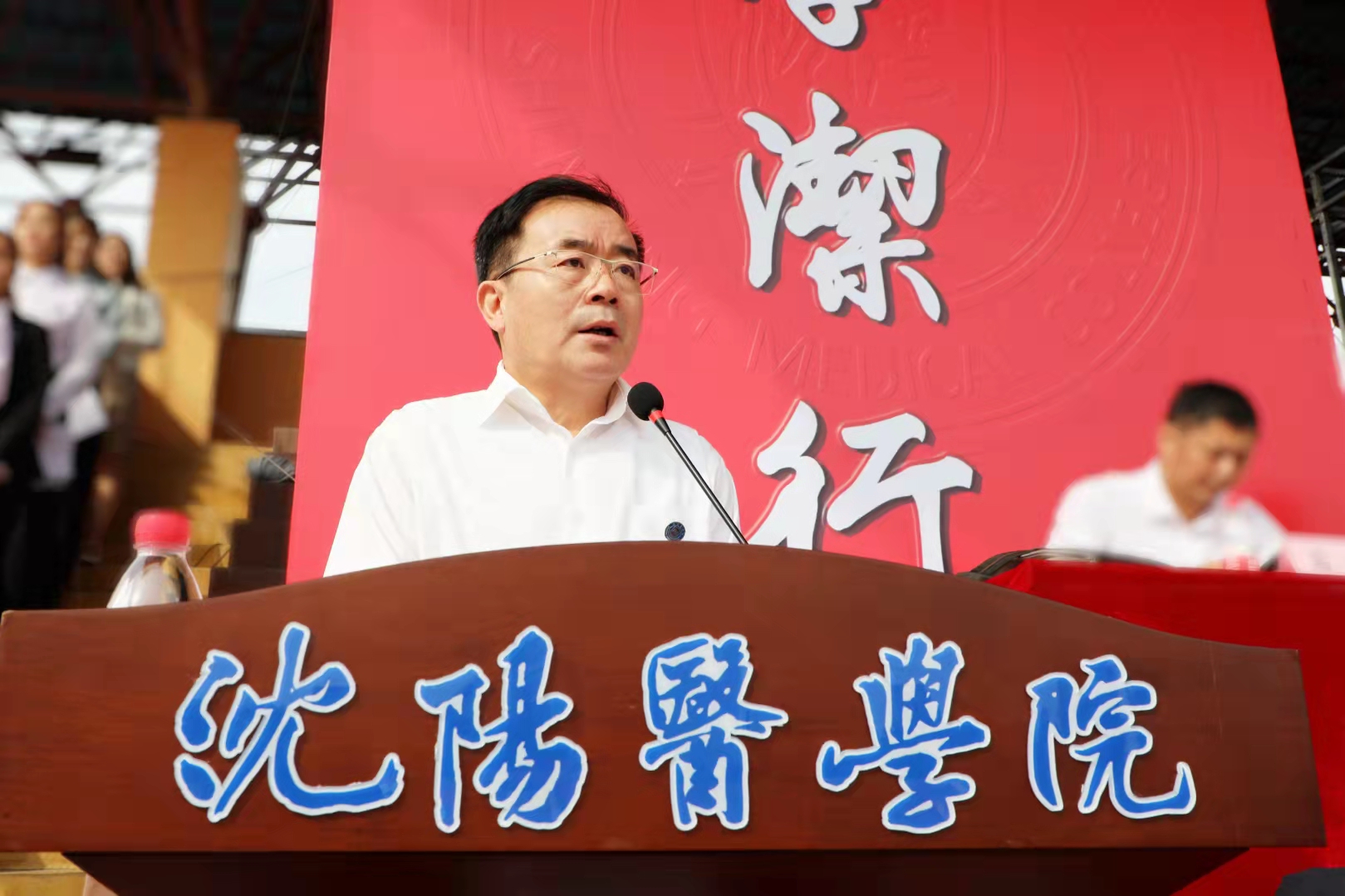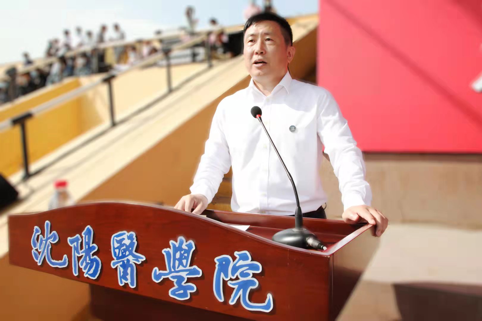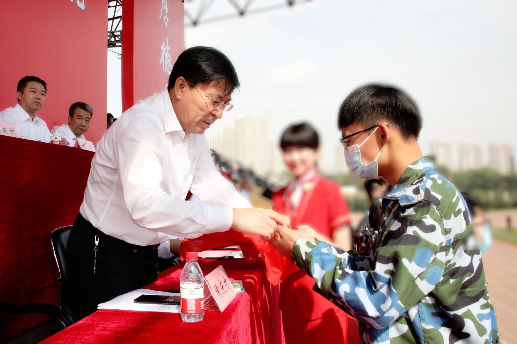 开学典礼上,党委书记陶庆才教授为新生代表佩戴校徽,勉励新沈医人传承沈医“艰苦奋斗、自强不息”的优良传统,不忘初心、牢记使命,以弘毅之志共筑青春梦想,以奋斗之姿汲取前行力量。