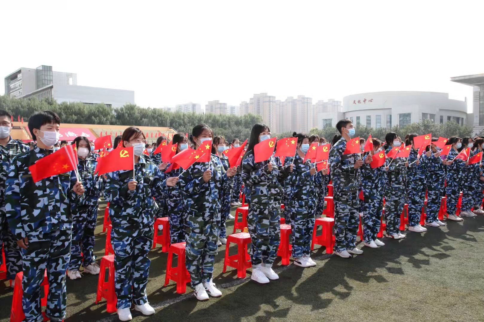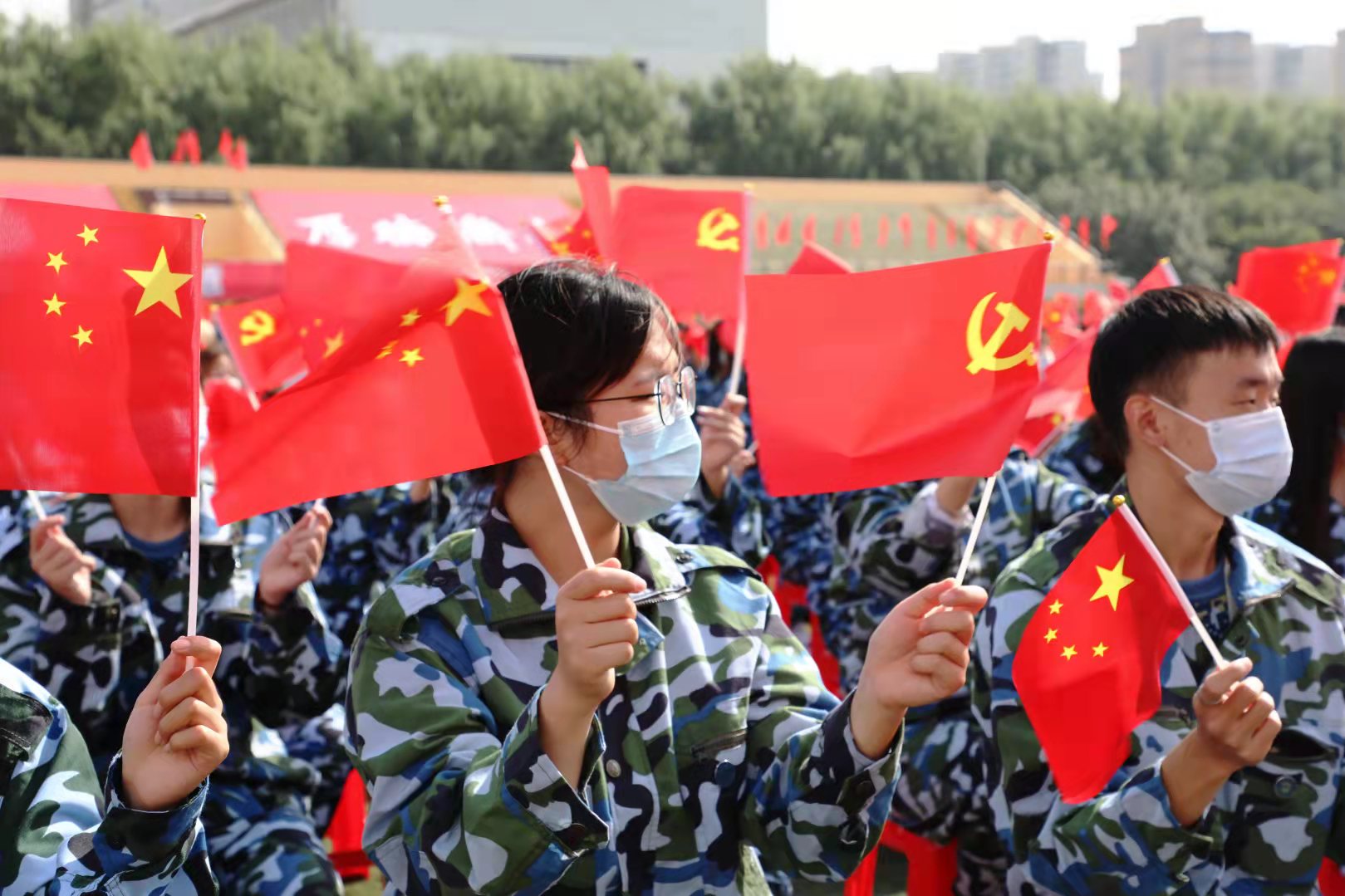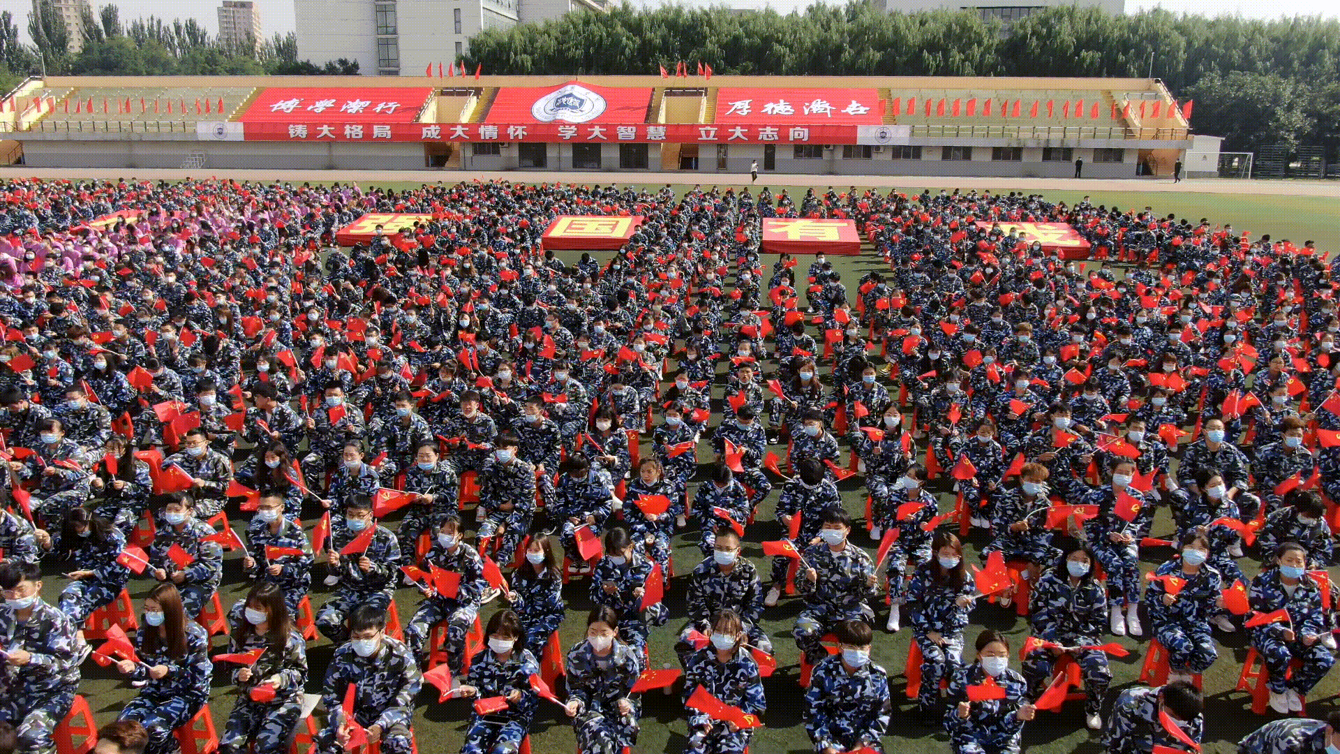 开学典礼在全体师生合唱的校歌声中结束,同学们齐声高呼“请党放心、强国有我”!