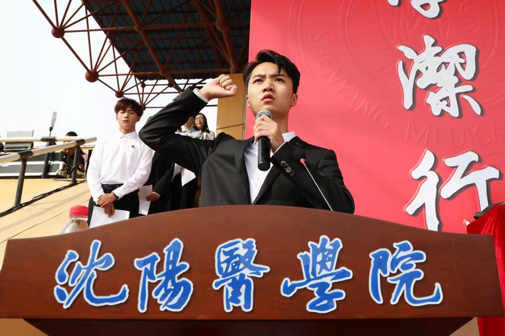 任甫院长在题为《铸大格局、成大情怀、学大智慧、立大志向》的讲话中,代表全校师生对新同学的到来表示热烈的欢迎和衷心的祝贺,并与新生们分享了“幸运、幸福、幸会”三个关键词,他强调,同学们生在红旗下是“幸运”,同学们恰逢强国时是“幸福”,同学们成为沈小医是“幸会”。