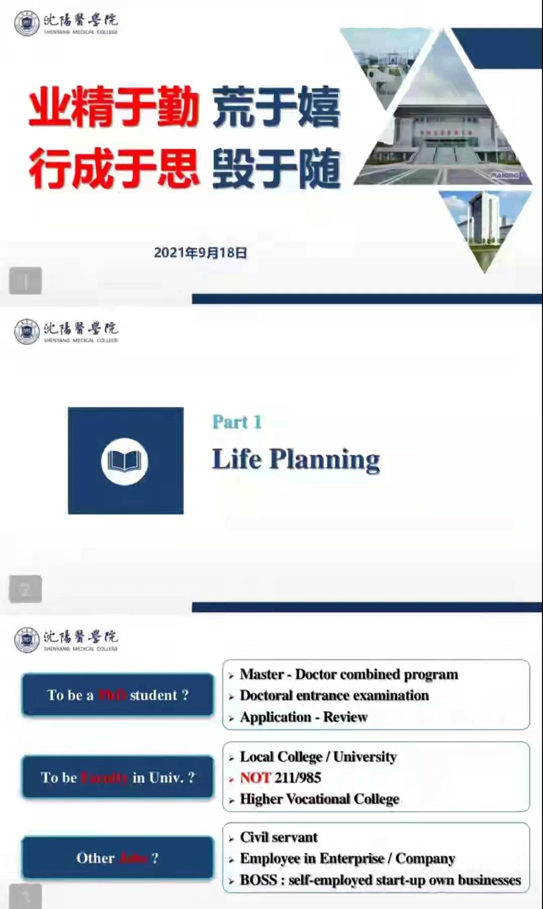 9月17日下午,全体研究生新生开展了校史校情教育,同学了解学校辉煌的发展历史,同学们表示要继承和发扬沈医精神,增强新生对学校的认同感、归属感和自豪感。
