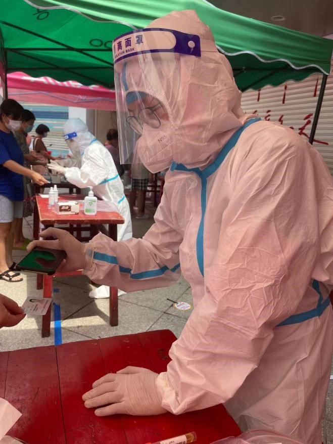 在仙游县鲤城街道洪桥社区的全员核酸检测采集点,柳剑新同学配合医护人员进行信息采集,维持现场秩序。发挥自己医学生的优势帮助现场群众缓解心理压力,讲解个人防护方法。在核酸采集休息间隙,他又立即回到社区,帮助社区干部向隔离小区配发食品物资,穿着厚厚的防护服,每天将上百箱物品送到各家各户住户手中。