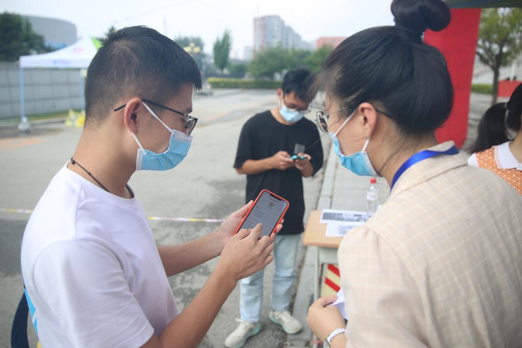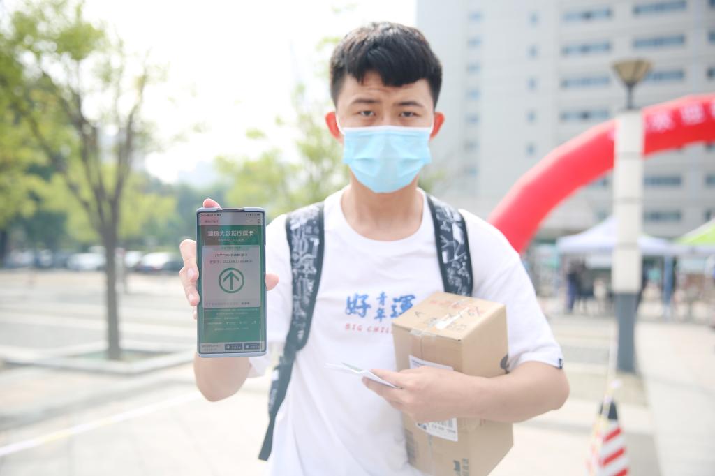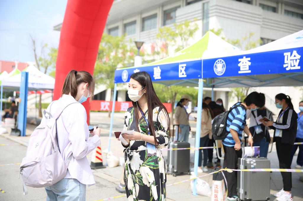 一夜的大雨没有浇灭学生回归校园的激动心情。早上,不到7:00,就陆续有学生来到学校南门外翘首以待。“请准备好身份证、学生证、核酸检测阴性证明、今日校园审批通过‘笑脸’”,为守住校园安全阵地,每名学生在登机、登车前48小时内需进行核酸检测,凭阴性报告方可入校。为高效、有序、安全开展学生返校和疫情防控工作,学校在学生返校前利用今日校园app开启入校核验功能。学生提前在线上填报个人相关信息,提交返校申请,辅导员对学生返校资格进行审核,批准通过会获得一个审核通过“笑脸”标志,真正做到疫情防控关口前移。返校现场,在工作人员的引导下,学生有序经过测量体温,身份核验,返校资格查验,核酸阴性证明查验,健康码、行程码“双码”查验等环节。