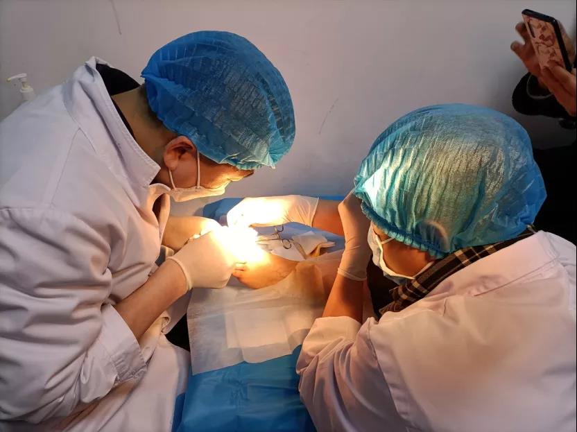 3月25日,孙赫非医生在白琰医生的协助下,在处置室为一名甲沟炎患者行甲床重建手术。
