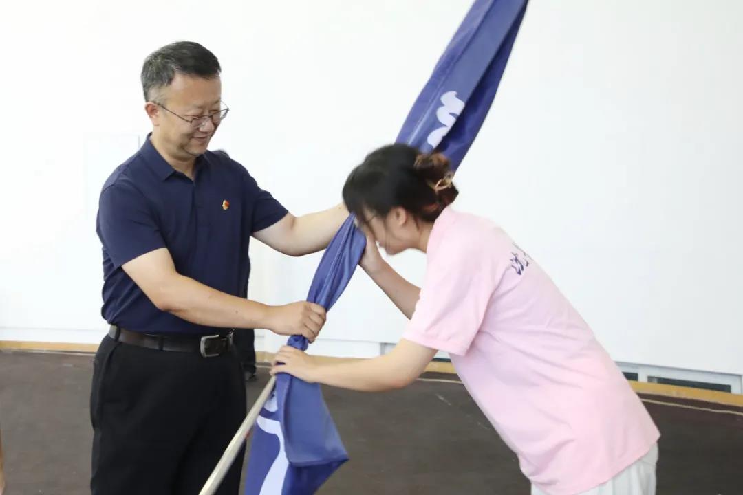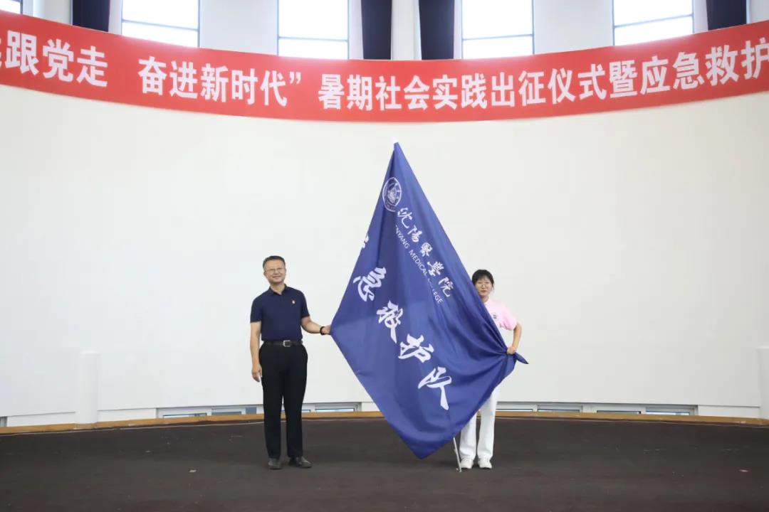 仪式伊始,分别由团委丛巍松老师和教务处张益凡老师宣读《2021年辽宁省大中专学生暑期“三下乡”社会实践活动的通知》《米兰milan官方网站2021年暑期社会实践团队名单》和《米兰milan官方网站应急救护陪护要求》《米兰milan官方网站首批应急救护培训导师培训班学员名单》。随后,团委杨迪书记为本次暑期社会实践各团队授旗,临床教学实验中心张汝峰副主任为应急救护培训导师班授“米兰milan官方网站应急救护队”队旗。最后,教务处高松处长宣布米兰milan官方网站“永远跟党走 奋进新时代”暑期社会实践团队正式出征,米兰milan官方网站应急救护培训导师班正式开班。