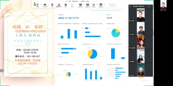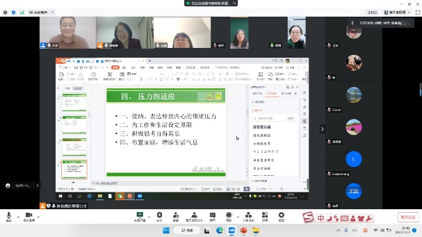 在疫情防控特殊时期,外语教学部第一党支部全体党员教师“闻令而行,无缝连接” ,为学生奉上一堂堂丰富多彩的线上教学课。在辛勤付出的同时,教师们的心理压力有所增加。12月3日晚8时,第一党支部邀请校大学生心理咨询中心主任陈魁敏教授在腾讯会议室为支部党员以及外语教学部本科第一、二教研室的教师群众讲解疫情“心”知识。在近1小时的线上宣讲中,陈教授亲切的话语、简单实用的心理调适技巧以及与教师们的答疑互动为居家办公的同事带来了温暖。